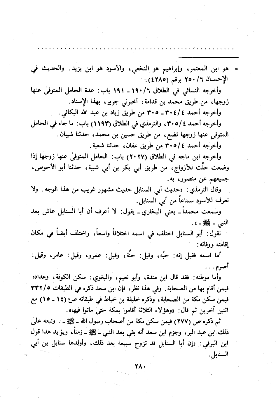 ثم ذكره ص (277) فيمن سكن مكة من أصحاب رسول الله -صلى الله عليه وسلم-. وتبعه على ذلك ابن عبد البر، وجزم ابن سعد أنه بقي بعد النبي - صلى الله عليه وسلم -زمناً، ويؤيد هذا قول ابن البرقي: "إن أبا السنابل قد تزوج سبيعة بعد ذلك، وأولدها سنابل بن أبي السنابل. =