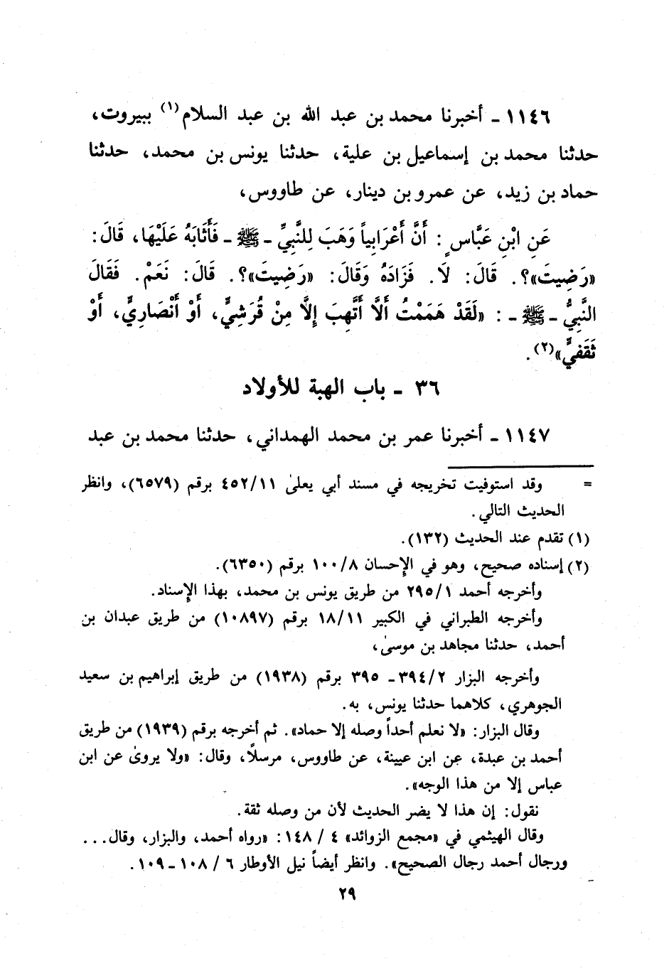 1146 - أخبرنا محمد بن عبد الله بن عبد السلام (¬1) ببيروت، حدثنا محمد بن إسماعيل بن علية، حدثنا يونس بن محمد، حدثنا حماد بن زيد، عن عمرو بن دينار، عن طاووس،
