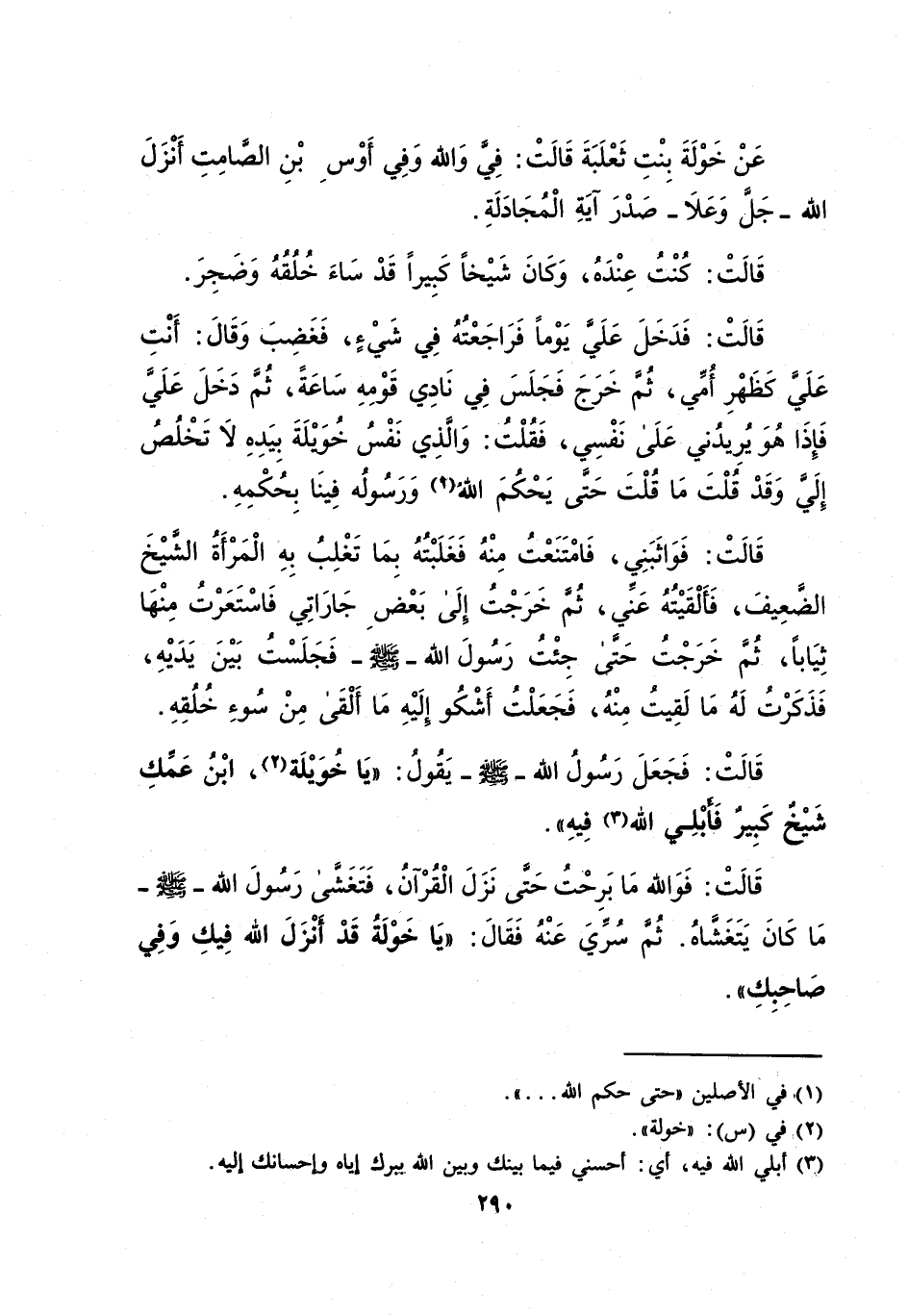 قَالَتْ: كُنْتُ عِنْدَهُ، وَكَانَ شَيْخاً كَبِيراً قَدْ سَاءَ خُلُقُهُ وَضَجِرَ. قَالَتْ: فَدَخَلَ عَلَيَّ يَوْماً فَرَاجَعْتُهُ فِي شَيْءٍ، فَغَضِبَ وَقَالَ: أَنْتِ عَلَيَّ كَظَهْرِ أُمِّي، ثُمَّ خَرَجَ فَجَلَسَ فِي نَادِي قَوْمِهِ سَاعَةً، ثُمَّ دَخَلَ عَلَيَّ فَإِذَا هُوَ يُرِيدُني عَلَى نَفْسِي، فَقُلْتُ: وَالَّذِي نَفْسُ خُويلَةَ بِيَدِهِ لا تَخْلُصُ إِلَيَّ وَقَدْ قُلْتَ مَا قُلْتَ حَتَّى يَحْكُمَ اللهُ (¬1) وَرَسُوُله فِينَا بِحُكْمِهِ. قَالَتْ: فَوَاثَبَنِي، فَامْتَنَعْتُ مِنْهُ فَغَلَبْتُهُ بِمَا تَغْلِبُ بِهِ الْمَرْأَةُ الشيْخَ الضَّعِيفَ، فَاَلْقَيْتُهُ عَنِّي، ثُم خَرَجْتُ إلَى بَعْضِ جَارَاتِي فَاسْتَعَرْتُ مِنْهَا ثِيَاباً، ثُمَّ خَرَجْتُ حَتَّي جِئْتُ رَسُولَ الله - صلى الله عليه وسلم - فَجَلَسْتُ بَيْنَ يَدَيْهِ، فَذَكَرْتُ لَهُ مَا لَقِيتُ مِنْهُ، فَجَعَلْتُ أَشْكُو إلَيْهِ مَا أَلْقَى مِنْ سُوءِ خُلُقِهِ. قَالَتْ: فَجَعَلَ رَسُولُ الله - صلى الله عليه وسلم - يَقُولُ: "يَا خُوَيْلَة (¬2)، ابْنُ عَمِّكِ شَيْخٌ كبِيرٌ فَأَبْلِى الله (¬3) فِيهِ". قَالَتْ: فَوَالله مَا بَرِحْتُ حَتَّى نَزَلَ الْقُرْآنُ، فَتَغَشَّى رَسُولَ الله - صلى الله عليه وسلم - مَا كَانَ يَتَغَشَّاهُ. ثُمَّ سُرِّيَ عَنْهُ فَقَالَ: "يَا خَوْلَةُ قَدْ أنْزَلَ الله فِيكِ وَفِي صَاحِبِكِ".