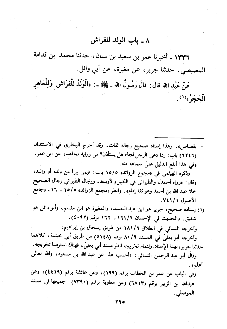 1336 - أخبرنا عمر بن سعيد بن سنان، حدثنا محمد بن قدامة المصيصي، حدثنا جرير، عن مغيرة، عن أبي وائل.