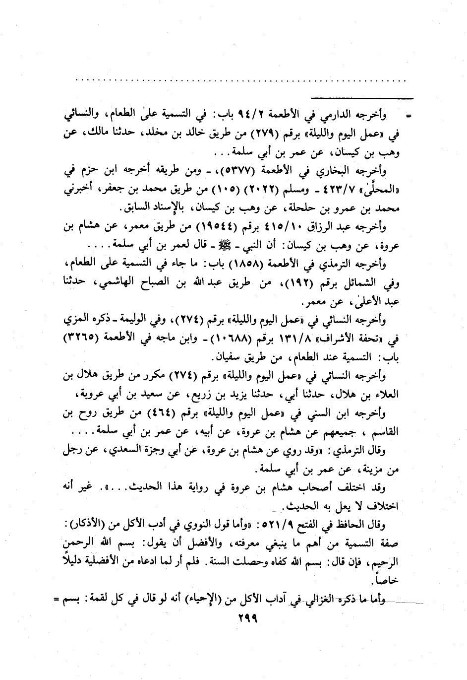 وقال الحافظ في الفتح 9/ 521: "وأما قول النووي في أدب الأكل من (الأذكار): صفة التسمية من أهم ما ينبغي معرفته، والأفضل أن يقول: بسم الله الرحمن الرحيم، فإن قال: بسم الله كفاه وحصلت السنة. فلم أر لما ادعاه من الأفضلية دليلاً خاصاً.