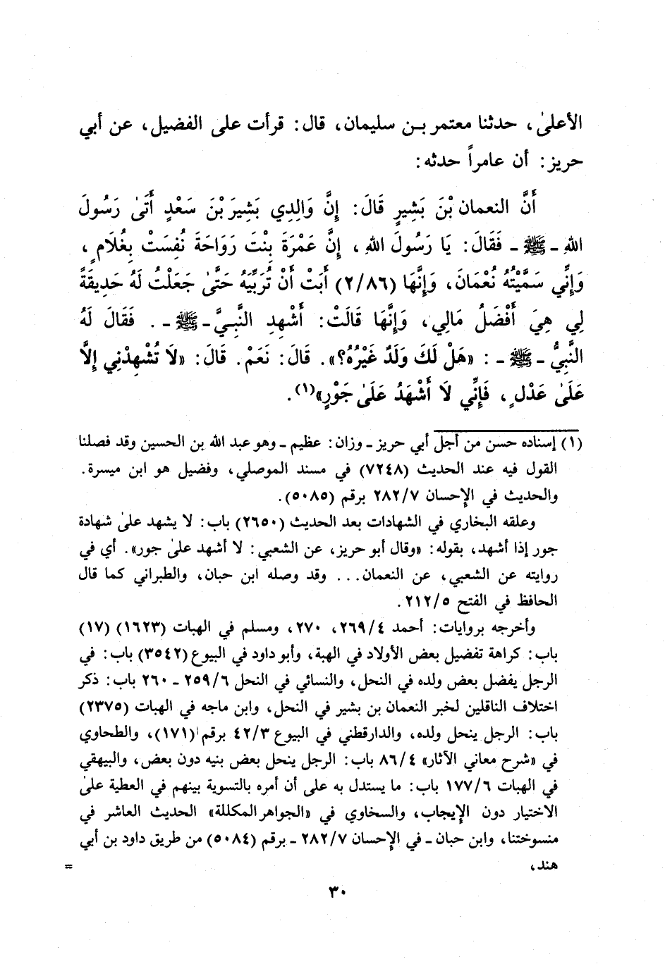 الأعلى، حدثنا معتمر بن سليمان، قال: قرأت على الفضيل، عن أبي حريز: أن عامراً حدثه: أن النعمان بْنَ بَشِيرٍ قَالَ: إِنَّ وَالِدِي بَشِيرَ بْنَ سَعْدٍ أتَى رَسُولَ اللهِ - صلى الله عليه وسلم - فَقَالَ: يَا رَسُولَ اللهِ، إنَّ عَمْرَةَ بِنْتَ رَوَاحَةَ نُفِسَتْ بِغُلاَمٍ، وَإنِّي سَمَّيْتُهُ نُعْمَانَ، وَإنَّهَا (2/ 86) أبَتْ أنْ تُرَبِّيَهُ حَتى جَعَلْتُ لَهُ حَدِيقَةً لِي هِيَ أفْضَلُ مَالِي، وَإنَّهَا قَالَتْ: أشْهِدِ النبِيَّ - صلى الله عليه وسلم -. فَقَالَ لَهُ النبِيُّ - صلى الله عليه وسلم -:" هَلْ لَكَ وَلَدٌ غيْرُهُ؟ ". قَالَ: نَعَمْ. قَالَ: "لا تُشْهِدْنِي إلا عَلَى عَدْلٍ، فَإِنّي لا أشْهَدُ عَلَى جَوْرٍ" (¬1).