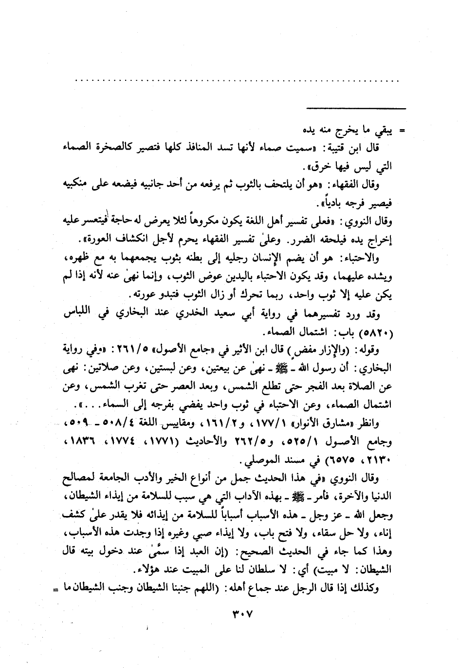 وقال النووي: "فعلى تفسير أهل اللغة يكون مكروهاً لئلا يعرض له حاجة فيتعسر عليه إخراج يده فيلحقه الضرر. وعلى تفسير الفقهاء يحرم لأجل انكشاف العورة".