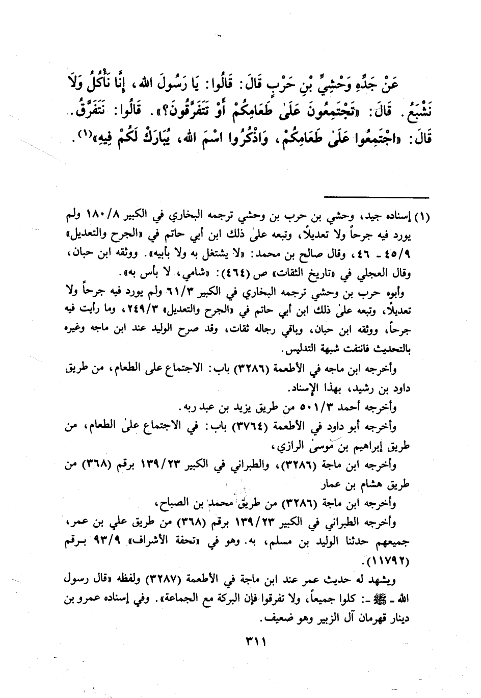 عَنْ جَدِّهِ وَحْشِيِّ بْنِ حَرْبٍ قَالَ: قَالُوا: يَا رسول الله، إنُّا نَأْكُلُ وَلا نَشْبَعُ. قَالَ-: "تجْتَمِعُونَ عَلَى طَعَامِكُمْ أوْ تَتَفَرُّقُونَ؟ ". قَالُوا: نَتَفَرَّقُ. قَالَ:" اجْتَمِعُوا عَلَى طَعَامِكُمْ، وَاذْكُرُوا اسْمَ الله، يبارَكْ لَكُمْ فِيهِ" (¬1).