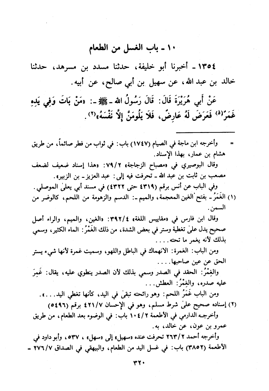 عَنْ أَبي هُرَيْرَةَ قَالَ: قَالَ رَسُولُ الله - صلى الله عليه وسلم -: مَنْ بَاتَ وَفِي يَدِهِ غمرٌ (¬1) فَعَرَضَ لَهُ عَارِضٌ، فَلاَ يَلُومَنَّ إلاَّ نَفْسَهُ" (¬2).