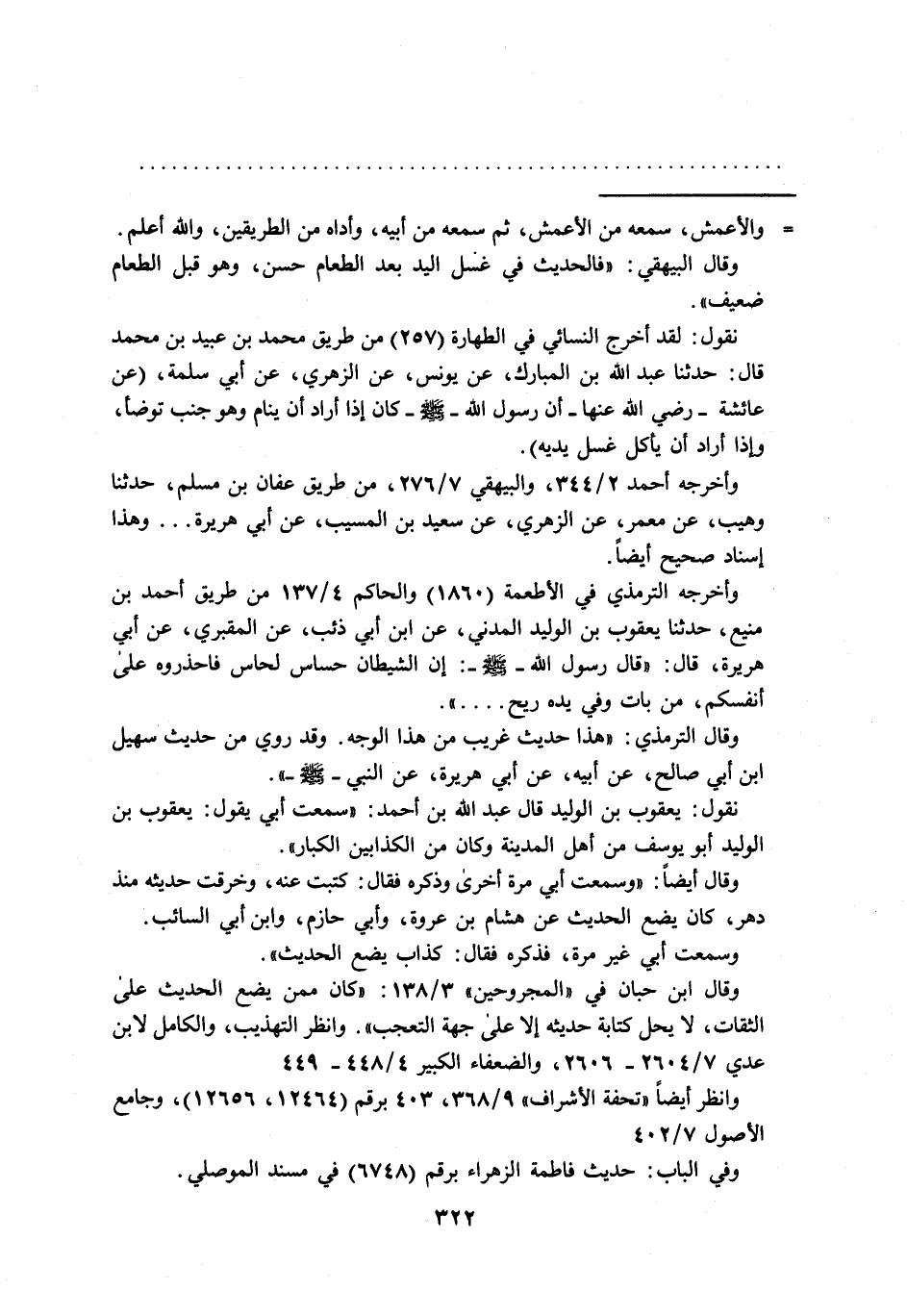 = والأعمش، سمعه من الأعمش، ثم سمعه من أبيه، وأداه من الطريقين، والله أعلم. وقال البيهقي: "فالحديث في غسل اليد بعد الطعام حسن، وهو قبل الطعام ضعيف".
