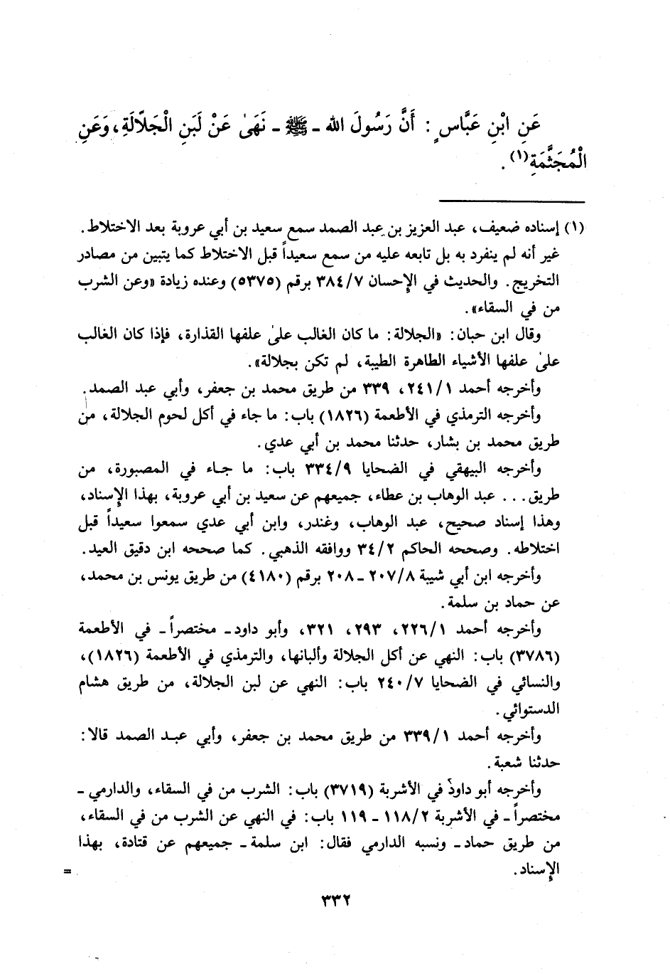 عَنِ ابْنِ عَباس: أَنَّ رَسُولَ الله -صلى الله عليه وسلم- نَهَى عَنْ لَبَنِ الْجَلاّلَةِ، وَعَنِ الْمُجَثَّمَةِ (¬1).