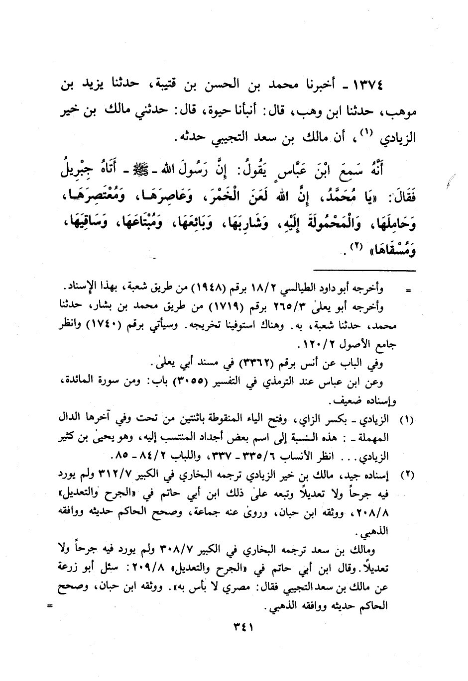 1374 - أخبرنا محمد بن الحسن بن قتيبة، حدثنا يزيد بن موهب، حدثنا ابن وهب، قال: أنبأنا حيوة، قال: حدثني مالك بن خير الزيادي (¬1)، أن مالك بن سعد التجيبي حدثه. أَنَّهُ سَمعَ ابْنَ عَبَّاسٍ يَقُولُ: إِنَّ رَسُولَ الله -صلى الله عليه وسلم- أَتَاهُ جِبْرِيلُ فَقَالَ بن: "يَا مُحَمَّدُ، إِنَّ الله لَعَنَ الْخَمْرَ، وَعَاصِرَهَا، وَمُعْتَصِرَهَا، وَحَامِلَهَا، وَالْمَحْمُولَةَ إلَيْهِ، وَشَارِبَهَا، وَبَائعَهَا، وَمُبْتَاعَهَا، وَسَاقِيَهَا، وَمُسْقَاهَا" (¬2).