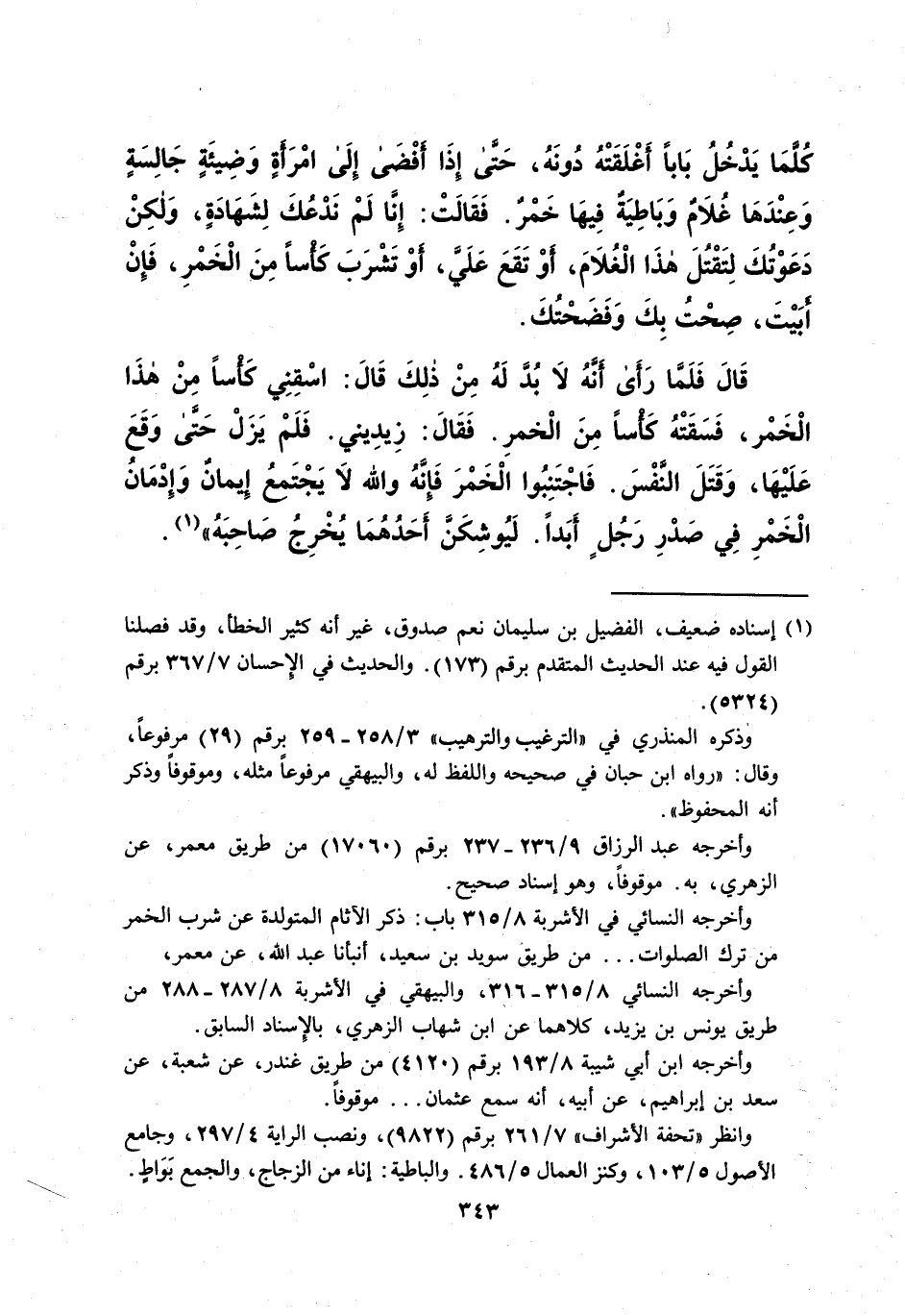 كُلَّمَا يَدْخُلُ بَاباً أَغْلَقَتْهُ دُونَهُ، حَتَّى إذَا أفْضَى إِلَى امْرَأَةٍ وَضِيئَةٍ جَالِسَةٍ وَعِنْدَهَا غُلام وَبَاطِيَةٌ فِيهَا خَمْرٌ. فَقَالَتْ: إِنَّا لَمْ نَدْعُكَ لِشَهَادَةٍ، وَلكنْ دَعَوْتُكَ لِتَقْتلَ هذَا الْغُلاَمَ، أَوْ تَقَعَ عَلَيَّ، أوْ تَشْرَبَ كَأْساً مِنَ الْخَمْرِ، فَإِنْ أبَيْتَ، صِحْتُ بِكَ وَفَضَحْتُكَ. قَالَ فَلَمَّا رَأَى أَّنهُ لا بُدَّ لَهُ مِنْ ذلِكَ قَالَ: اسقنى كَاساً مِنْ هذَا الْخَمْر، فَسَقَتْهُ كَأساً مِنَ الْخمرِ. فَقَالَ: زِيدِيني. فَلَمْ يَزَلْ حَتَّى وَقَعَ عَلَيْهَا، وَقَتَلَ النفس. فَاجْتَنِبُوا الْخَمْرَ فَإنَّهُ والله لا يَجْتَمعُ إيمانٌ وَإِدْمَانُ الْخَمْرِ فِي صَدْرِ رَجُلٍ أَبَداً. لَيُوشِكَنَّ أَحَدُهُمَا يُخْرِجُ صَاحِبَهُ (¬1).