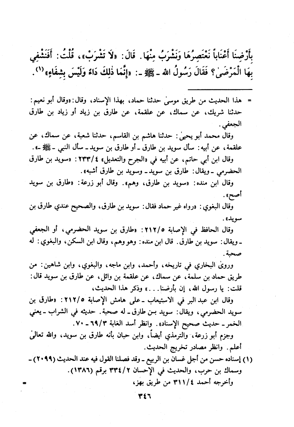 بِأَرْضِنَا أَعْنَاباً نَعْتَصِرُهَا وَنَشْرَبُ مِنْهَا. قَالَ: "لا تَشْرَبْ"، قُلْتُ: أَفَنَشْفِي بِهَا الْمَرْضَى؟ فَقَالَ رَسُولُ الله - صلى الله عليه وسلم -: "إِنمَا ذلِكَ دَاءٌ وَلَيْسَ بِشِفَاءٍ" (¬1).
