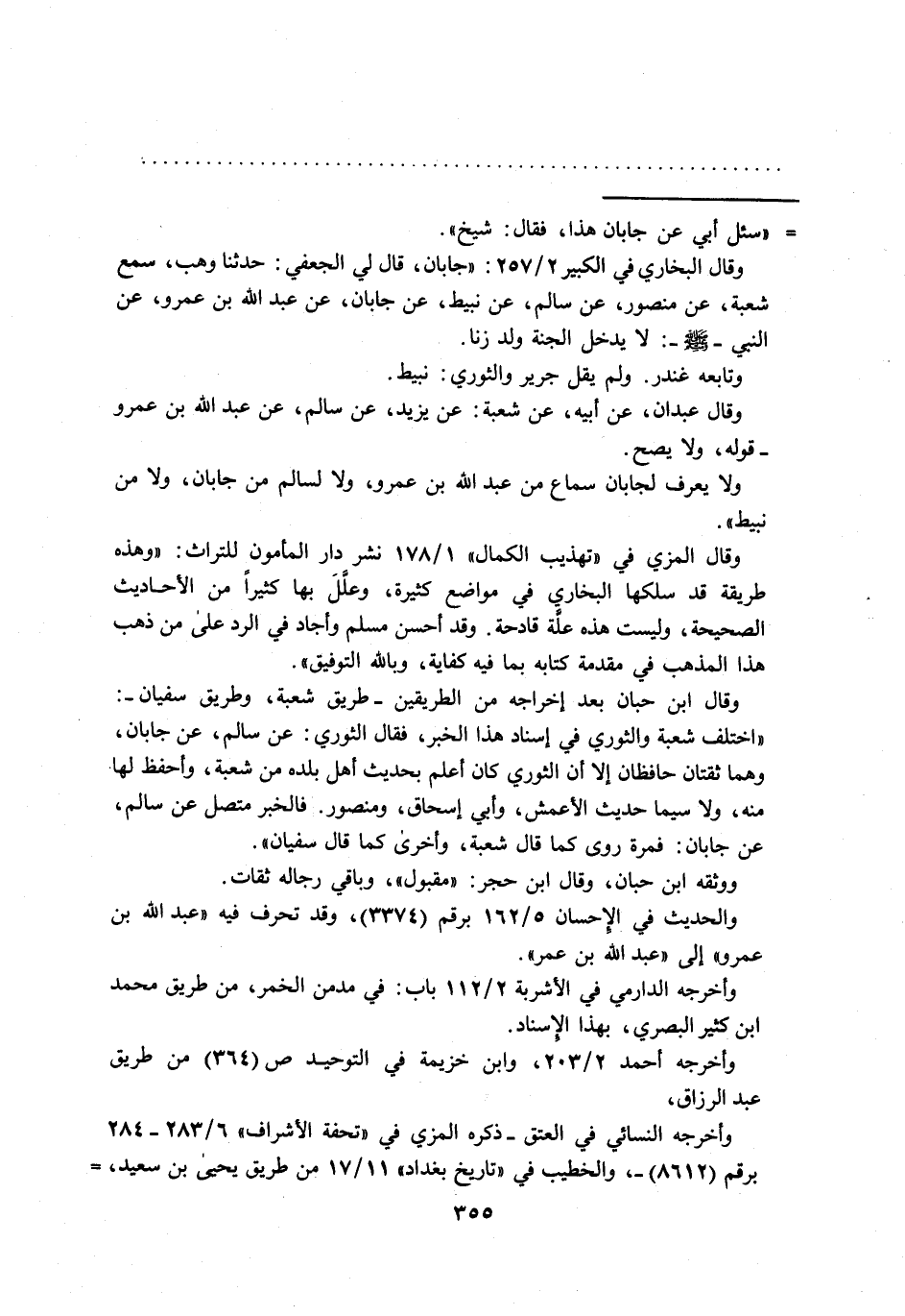 وقال البخاري في الكبير 2/ 257: "جابان، قال لي الجعفي: حدثنا وهب، سمع شعبة، عن منصور، عن سالم، عن نبيط، عن جابان، عن عبد الله بن عمرو، عن النبي - صلى الله عليه وسلم -: لا يدخل الجنة ولد زنا. وتابعه غندر. ولم يقل جرير والثوري: نبيط. وقال عبدان، عن أبيه، عن شعبة: عن يزيد، عن سالم، عن عبد الله بن عمرو - قوله، ولايصح. ولا يعرف لجابان سماع من عبد الله بن عمرو، ولا لسالم من جابان، ولا من نبيط. وقال المزي في "تهذيب الكمال" 1/ 178 نشر دار المأمون للتراث: "وهذه طريقة قد سلكها البخاري في مواضع كثيرة، وعلَّلَ بها كثيراً من الأحاديث الصحيحة، وليست هذه علَّة قادحة. وقد أحسن مسلم وأجاد في الرد على من ذهب هذا المذهب في مقدمة كتابه بما فيه كفاية، وبالله التوفيق".