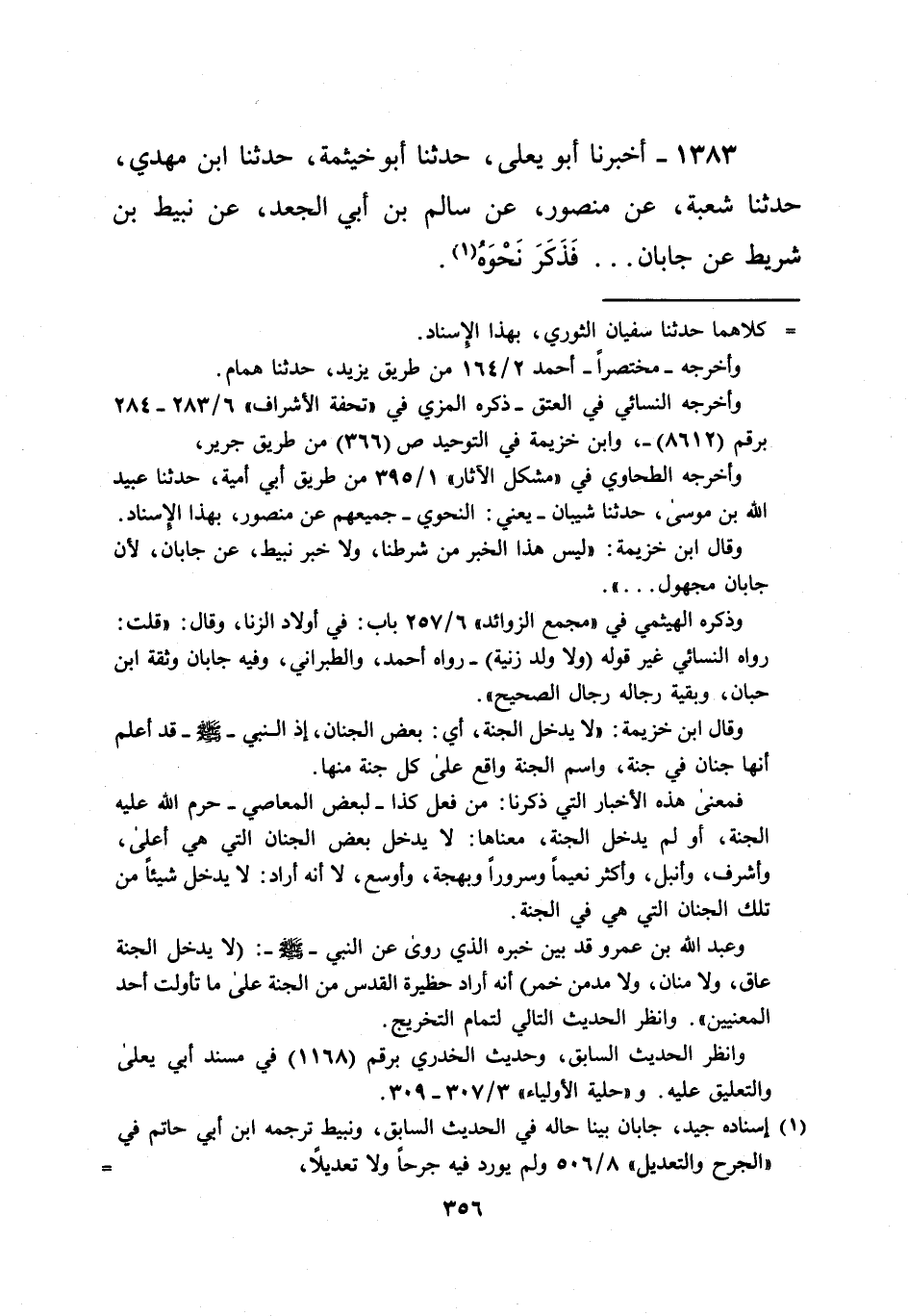 1383 - أخبرنا أبو يعلى، حدثنا أبو خيثمة، حدثنا ابن مهدي، حدثنا شعبة، عن منصور، عن سالم بن أبي الجعد، عن نبيط بن شريط عن جابان ... فَذَكَرَ نَحْوَهُ (¬1).