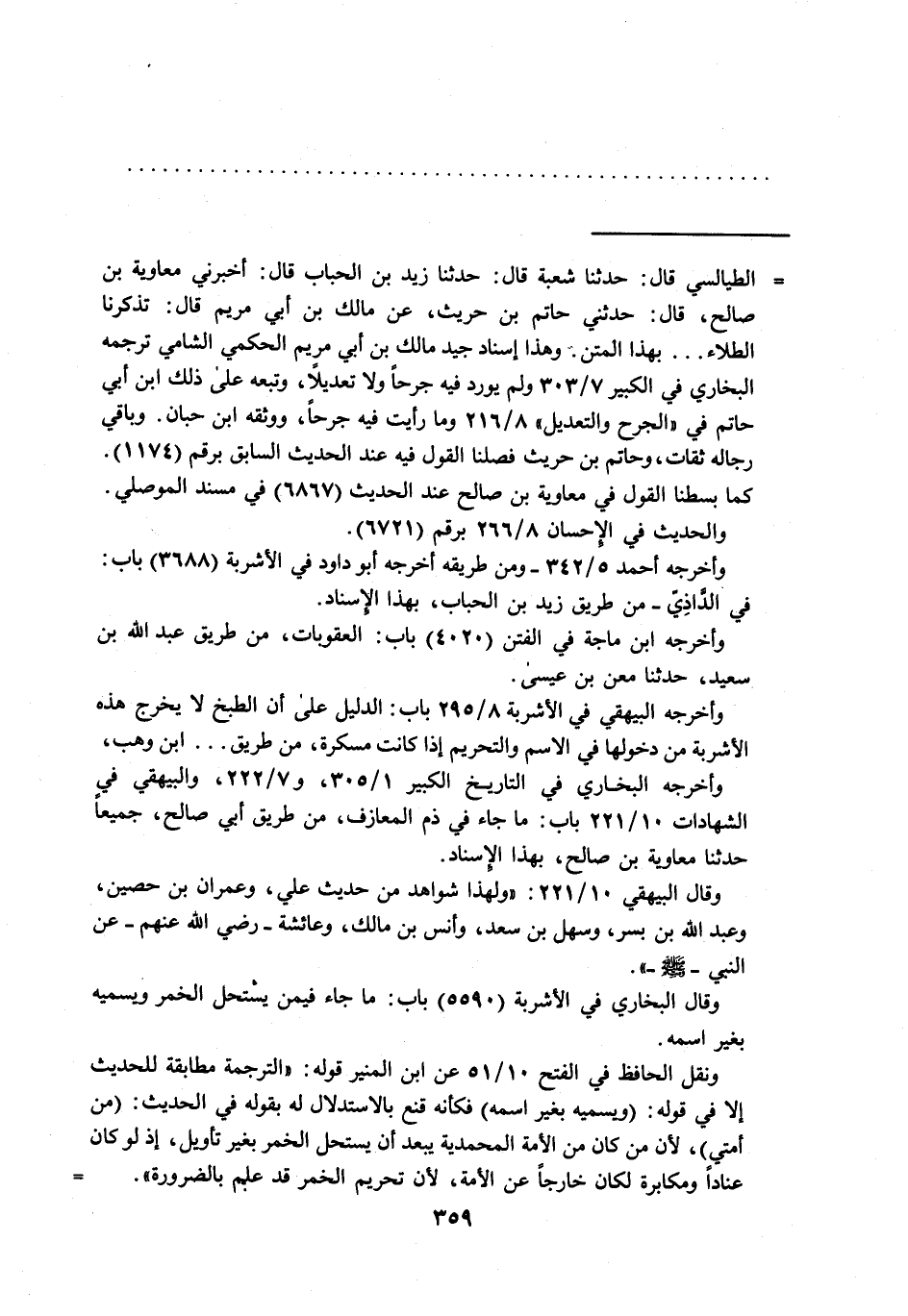 = الطيالسي قال: حدثنا شعبة قال: حدثنا زيد بن الحباب قال: أخبرني معاوية بن صالح، قال: حدثني حاتم بن حريث، عن مالك بن أبي مريم قال: تذكرنا الطلاء ... بهذا المتن. وهذا إسناد جيد مالك بن أبي مريم الحكمي الشامي ترجمه البخاري في الكبير 7/ 303 ولم يورد فيه جرحاً ولا تعديلاً، وتبعه على ذلك ابن أبي حاتم في "الجرح والتعديل" 8/ 216 وما رأيت فيه جرحاً، ووثقه ابن حبان. وباقي رجاله ثقات، وحاتم بن حريث فصلنا القول فيه عند الحديث السابق برقم (1174).
