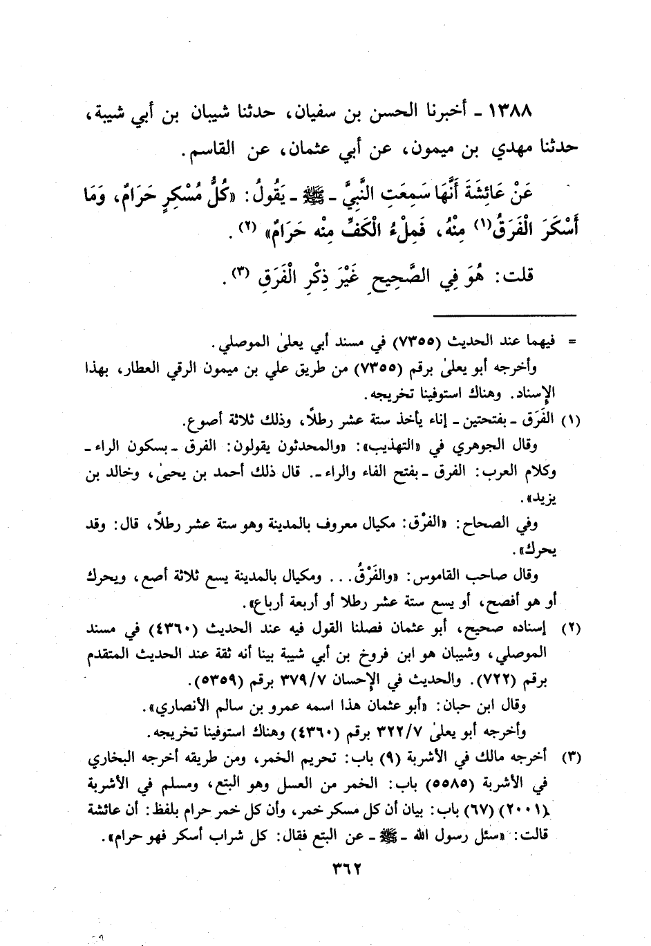 ْعَنْ عَائِشَةَ أَنَّهَا سَمِعَتِ النَّبِيَّ - صلى الله عليه وسلم - يَقُولُ: "كُلُّ مُسْكِرٍ حَرَامٌ، وَمَا أَسْكَرَ الْفَرَقُ (¬1) مِنْهُ، فَمِلْءُ الْكَفِّ مِنْه حَرَامٌ " (¬2). قلت: هُوَ فِي الصَّحِيحِ غَيْرَ ذِكْرِ الْفَرَقِ (¬3).