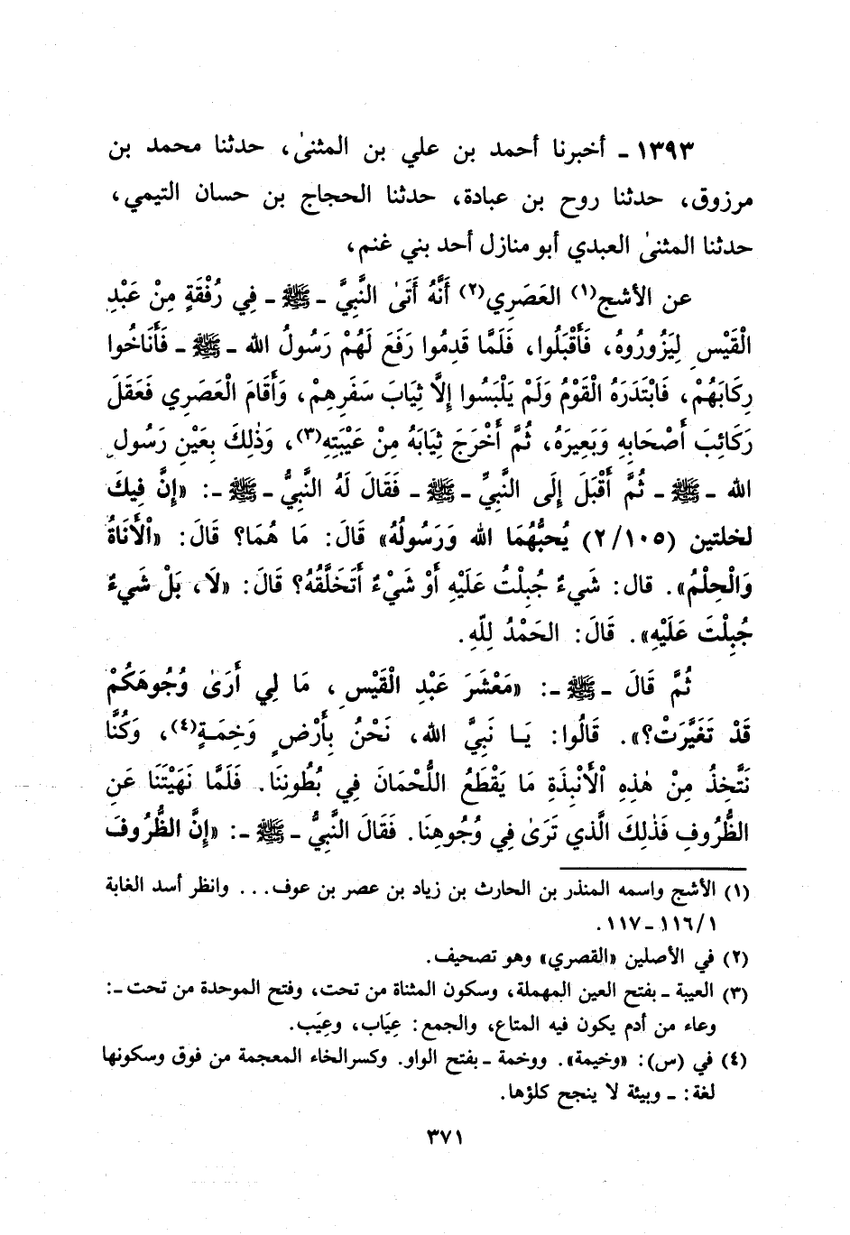1393 - أخبرنا أحمد بن علي بن المثنى، حدثنا محمد بن مرزوق، حدثنا روح بن عبادة، حدثنا الحجاج بن حسان التيمي، حدثنا المثنى العبدي أبو منازل أحد فى غنم، عن الأشج (¬1) العَصَرِي (¬2) أَنَّهُ أَتَى النَّبِيَّ - صلى الله عليه وسلم - فِي رُفْقَةٍ مِنْ عَبْدِ الْقَيْسِ لِيَزُورُوهُ، فَأقْبَلُوا، فَلَمَّا قَدِمُوا رَفَعَ لَهُمْ رَسُولُ الله - صلى الله عليه وسلم - فَأنَاخُوا رِكَابَهُمْ، فَابْتَدَرَهُ الْقَوْمُ وَلَمْ يَلْبَسُوا إِلاَّ ثِيَابَ سَفَرِهِمْ، وَأقَامَ الْعَصَرِي فَعَقَلَ رَكَائِبَ أصْحَابهِ وَبَعِيرَهُ، ثُم أخْرَجَ ثِيَابَهُ مِنْ عَيْبَتِهِ (¬3)، وَذلِكَ بِعَيْنِ رَسُول الله - صلى الله عليه وسلم - ثُمّ أقْبَلَ إلَى النَّبِي - صلى الله عليه وسلم - فَقَالَ لَهُ النَّبِيُّ - صلى الله عليه وسلم -: "إنَّ فيكَ لخلتين (105/ 2) يُحبهُمَا الله وَرَسُولُهُ" قَالَ: مَا هُمَا؟ قَالَ: "اْلأنَاةُ وَالْحِلْمُ". قال: شَيء جُبِلْتُ عَلَيْهِ أوْ شَيْءٌ " أتَخَلَّقُهُ؟ قَال: "لا، بَلْ شَيء جُبِلْتَ عَلَيْهِ". قالَ: الحَمْدُ لِلهِ. ثُم قَالَ - صلى الله عليه وسلم -: "مَعْشَرَ عَبْدِ الْقَيْسِ، مَا لِي أرَى وُجُوهَكُمْ قَدْ تغيَّرت؟. قالُوا: يَا نَبِيَّ الله، نَحْنُ بِأرْض وَخِمَةٍ (¬4)، وَكُنَّا نَتَّخِذُ مِنْ هذِهِ اْلأنْبِذَةِ مَا يَقْطَعُ اللُّحْمَانَ فِي بُطُونِنَا- فَلَمَّا نَهَيْتَنَا عَنِ الظُّرُوفِ فَذلِكَ الَّذي تَرَى فِي وُجُوهِنَا. فَقَالَ النَّبِيُّ - صلى الله عليه وسلم -: "إِنَّ الظُّرُوفَ