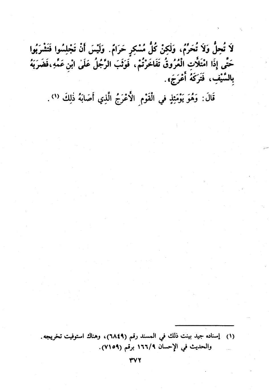 لا تُحِلُّ وَلا تُحَرِّمُ، وَلكِنْ كُلُّ مُسْكِرٍ حَرَامٌ. وَلَيْسَ أَنْ تَجْلِسُوا فَتَشْرَبُوا حَتَّى إذَا امْتَلأَتِ الْعُرُوقُ تَفَاخَرْتُمْ، فَوَثَبَ الرَّجُلُ عَلَى ابْنِ عَمهِ، فَضَرَبَهُ بالسيف، فَتَرَكَهُ أعْرَجَ ". قَالَ: وَهُوَ يَوْمَئِذٍ في الْقَوْمِ الأعْرَجُ الَّذِي أَصَابَهُ ذلِكَ (¬1).