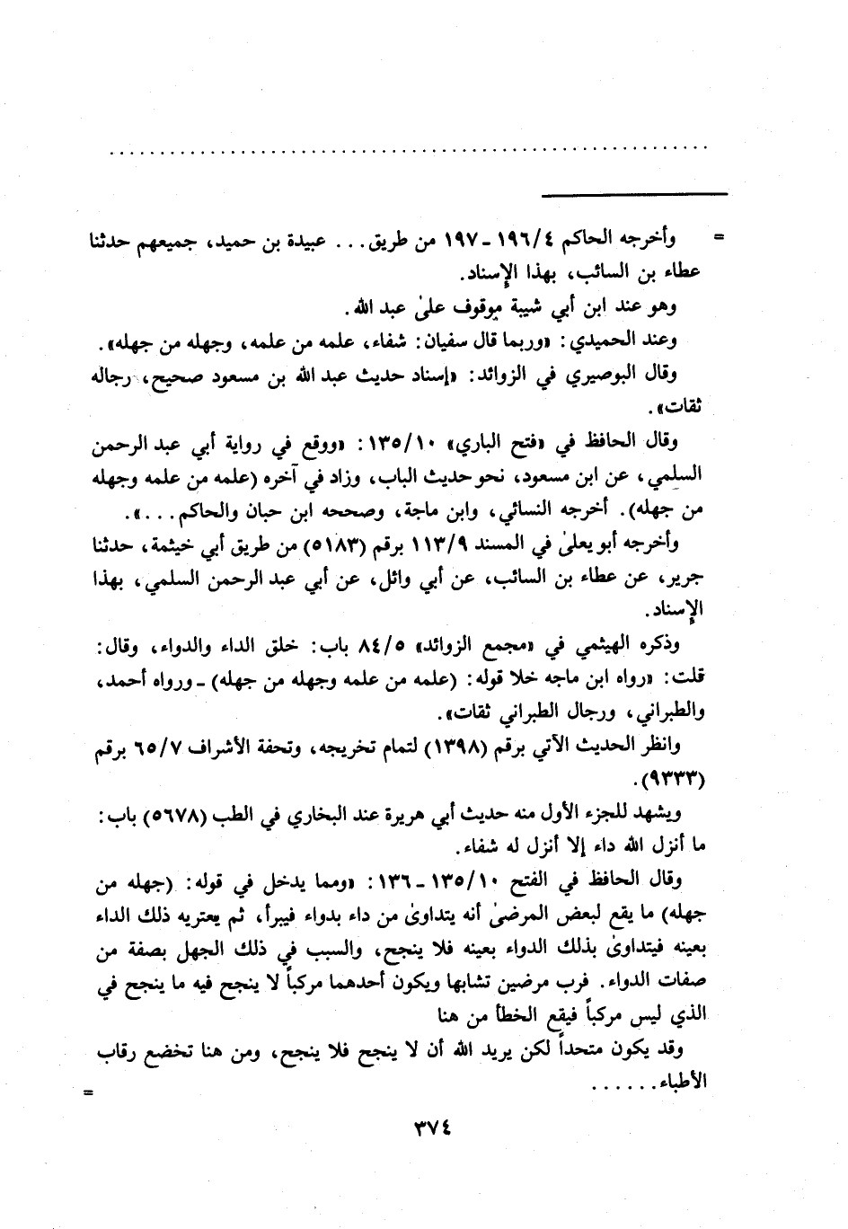 وقال الحافظ في الفتح 10/ 135 - 136: "ومما يدخل في قوله: (جهله من جهله) ما يقع لبعض المرضى أنه يتداوى من داء بدواء فيبرأ، ثم يعتريه ذلك الداء بعينه فيتداوى بذلك الدواء بعينه فلا ينجح، والسبب في ذلك الجهل بصفة من صفات الدواء. فرب مرضين تشابها ويكون أحدهما مركبأ لا ينجح فيه ما ينجح في الذي ليس مركباً فيمع الخطأ من هنا وقد يكون متحدا لكن يريد الله أن لا ينجح فلا ينجح، ومن هنا تخضع رقاب الأطباء ...... =