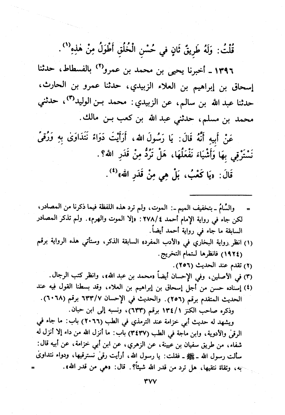 1396 - أخبرنا يحيى بن محمد بن عمرو (¬2) بالفسطاط، حدثنا إسحاق بن إبراهيم بن العلاء الزبيدي، حدثنا عمرو بن الحارث، حدثنا عبد الله بن سالم، عن الزبيدي: محمد بن الوليد (¬3)، حدثني محمد بن مسلم، حدثني عبد الله بن كعب بن مالك. عَنْ أَبيهِ أَنَّهُ قَالَ: يَا رسول الله، أَرَأَيْتَ دَوَاءً نَتَدَاوَى بِهِ وَرُقىً نَسْتَرْقِي بِهَا وَأَشْيَاءَ نَفْعَلُهَا، هَلْ تَرُدُّ مِنْ قَدَرِ الله؟. قَالَ: "يَا كَعْبُ، بَلْ هِي مِنْ قَدَرِ الله" (¬4).