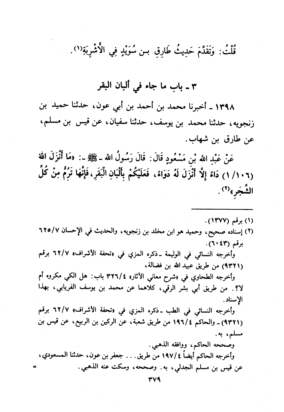 1398 - أخبرنا محمد بن أحمد بن أبي عون، حدثنا حميد بن زنجويه، حدثنا محمد بن يوسف، حدثنا سفيان، عن قيس بن مسلم، عن طارق بن شهاب.