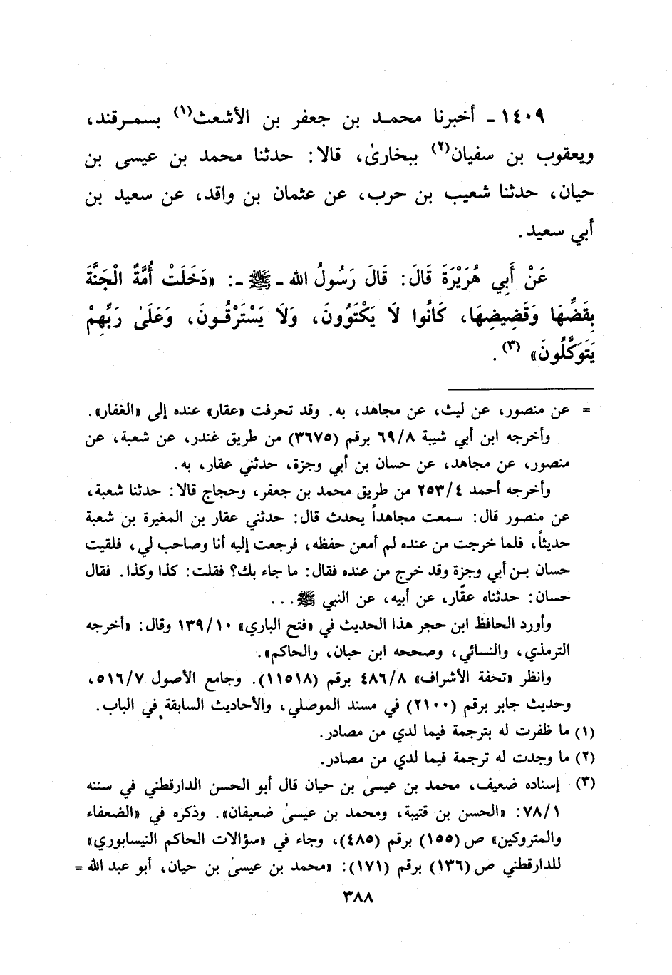 1409 - أخبرنا محمد بن جعفر بن الأشعث (¬1) بسمرقند، ويعقوب بن سفيان (¬2) ببخارى، قالا: حدثنا محمد بن عيسى بن حيان، حدثنا شعيب بن حرب، عن عثمان بن واقد، عن سعيد بن أبي سعيد.