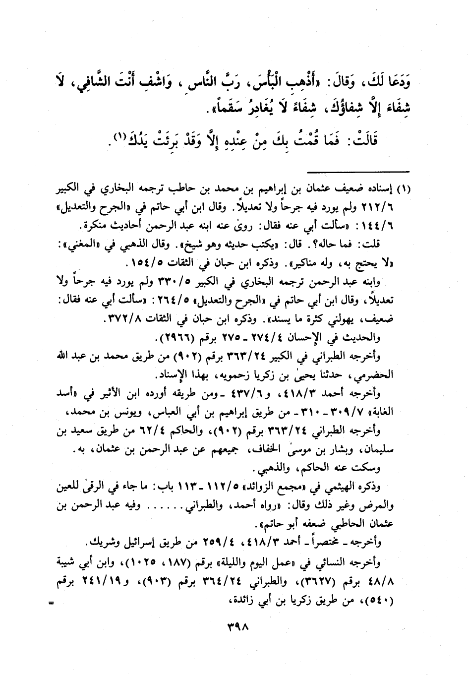 وذكره الهيثمي في "مجمع الزوائد" 5/ 112 - 113 باب: ما جاء في الرقى للعين والمرض وغير ذلك وقال: "رواه أحمد، والطبراني ...... وفيه عبد الرحمن بن عثمان الحاطبي ضعفه أبو حاتم ".