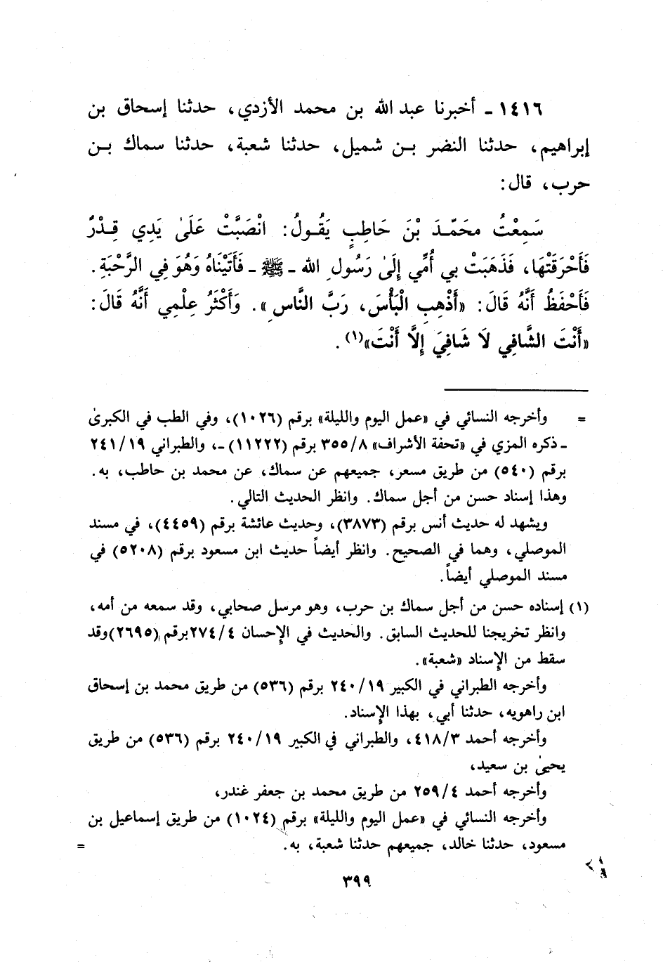 1416 - أخبرنا عبد الله بن محمد الأزدي، حدثنا إسحاق بن إبراهيم، حدثنا النضر بن شميل، حدثنا شعبة، حدثنا سماك بن حرب، قال: