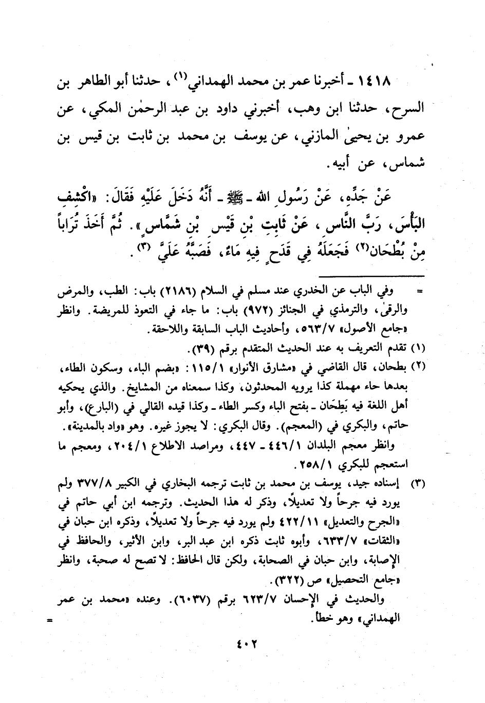 1418 - أخبرنا عمر بن محمد الهمداني (¬1)، حدثنا أبو الطاهر بن السرح، حدثنا ابن وهب، أخبرني داود بن عبد الرحمن المكي، عن عمرو بن يحيى المازني، عن يوسف بن محمد بن ثابت بن قيس بن شماس، عن أبيه.