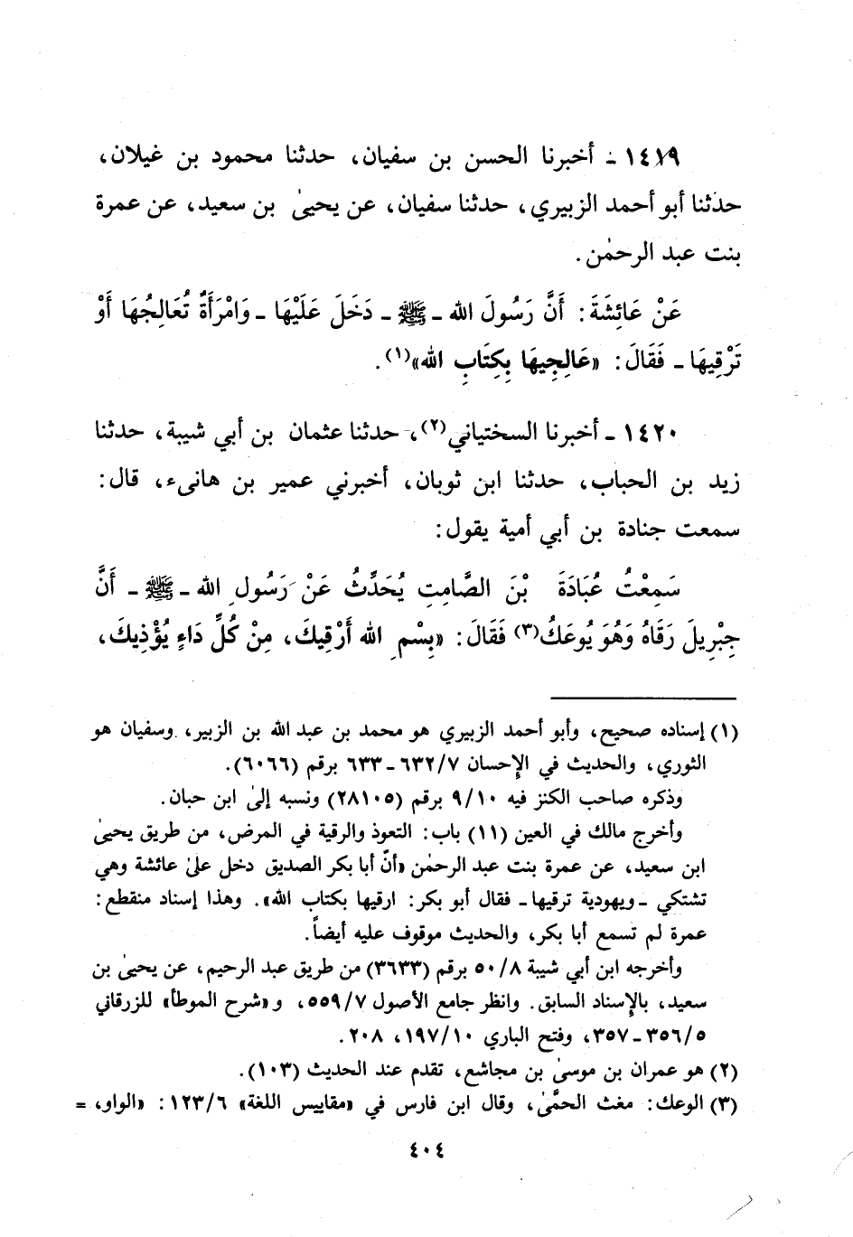 1419 - أخبرنا الحسن بن سفيان، حدثنا محمود بن غيلان، حدثنا أبو أحمد الزبيري، حدثنا سفيان، عن يحيى بن سعيد، عن عمرة بنت عبد الرحمن. عَنْ عَائِشَةَ: أَنَّ رسول الله - صلى الله عليه وسلم - دَخَلَ عَلَيْهَا- وَامْرَأَة تُعَالِجُهَا أَوْ تَرْقِيهَا- فَقَالَ: "عَالِجِيهَا بِكِتَابِ الله" (¬1).