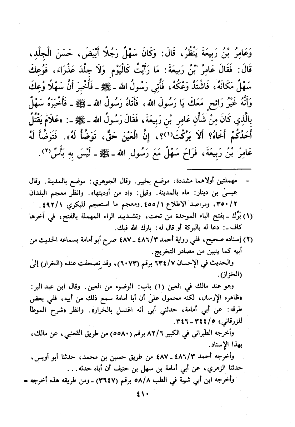 وَعَامِرُ بْنُ رَبِيعَةَ يَنْظُرُ، قَالَ: وَكَانَ سَهْلٌ رَجُلاً أَبْيَضَ، حَسَنَ الْجِلْدِ، قَالَ: فَقَالَ عَامِرُ بْنُ رَبيعَةَ: مَا رَأَيْتُ كَالْيَوْمِ وَلا جِلْدَ عَذْرَاءَ، فَوُعِكَ سَهْلٌ مَكَانَهُ، فَاشْتَدَّ وَعْكُهُ، فَأُتِي رَسُولُ الله - صلى الله عليه وسلم - فَأُخْبِرَ أَنَّ سَهْلاً وُعِكَ وَأَنَّهُ غَيرُ رَائِحٍ مَعَكَ يَا رسول الله، فَاَتَاهُ رَسُولُ الله - صلى الله عليه وسلم - فَأَخْبَرَهُ سَهْل بالَّذِي كَانَ مِنْ شَأنِ عَامِرِ بْنِ رَبِيعَةَ، فَقَالَ رَسُولُ الله - صلى الله عليه وسلم -: "عَلاَمَ يَقْتُلُ أًحَدُكمْ أَخَاهُ؟ أَلا بَرَّكْتَ (¬1)؟، إِنَّ الْعَيْنَ حَقٌّ، تَوَضَّأْ لَهُ". فَتَوَضَأَ لَهُ عَامِرُ بْنُ رَبِيعَةَ، فَرَاحَ سَهْل مَعَ رَسُولِ الله - صلى الله عليه وسلم - لَيْسَ بِهِ بَأْسٌ (¬2).