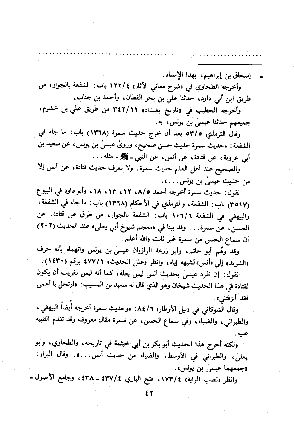 ْوقد وهَّم أبو حاتم، وأبو زرعة الرازيان عيسى بن يونس واتهماه بأنه حرف "الشريد" إلى "أَنس" لشبهه إياه، وانظر "علل بن الحديث" 1/ 477 برقم (1430). نقول: إن تفرد عيسى بحديث أَنس ليس بعلة، كما أنه ليس بغريب أن يكون لقتادة في هذا الحديث شيخان وهو الذي قال له سعيد بن المسيب:"ارتحل يا أعمى فقد أنزفتني".