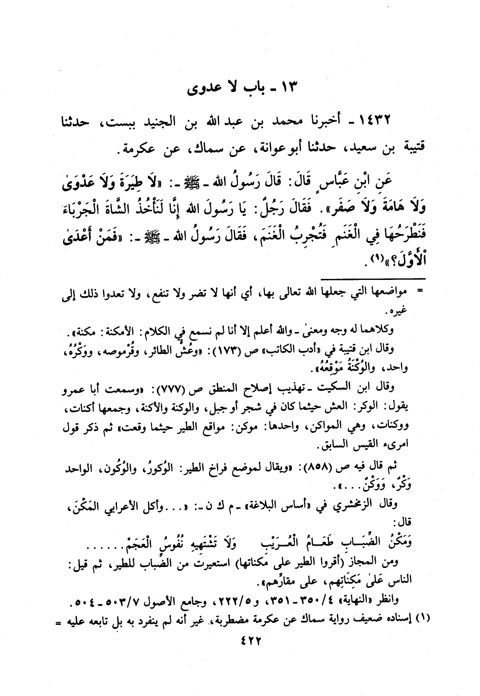 1432 - أخبرنا محمد بن عبد الله بن الجنيد ببست، حدثنا قتيبة بن سعيد، حدثنا أبو عوانة، عن سماك، عن عكرمة. عَنِ ابْنِ عَبَّاس قَالَ: قَالَ رَسُولُ الله - صلى الله عليه وسلم -: "لا طِيَرَةَ وَلا عَدْوَى وَلا هَامَةَ وَلاَ صَفَر". فَقَالَ رَجُل: يَارسول الله إِنَّا لَنَأْخُذُ الشاةَ الْجَرْبَاءَ" فَنَطْرَحُهَا فِي الْغَنَمِ فَتُجْرِبُ الْغَنَمَ، فَقَالَ رَسُولُ الله - صلى الله عليه وسلم -: "فَمَنْ أَعْدَى اْلأولَ؟ " (¬1).