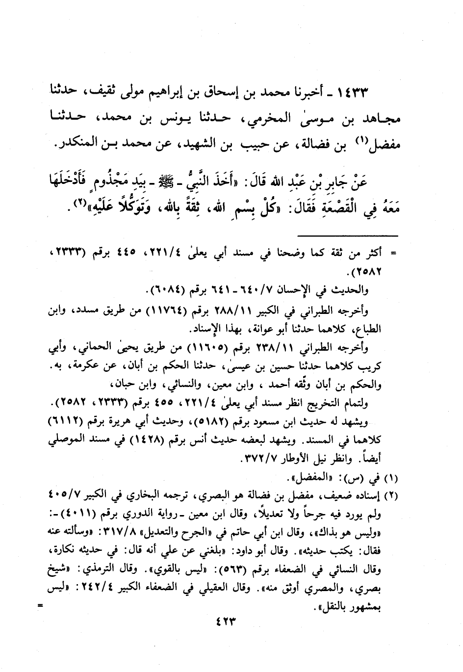 1433 - أخبرنا محمد بن إسحاق بن إبراهيم مولى ثقيف، حدثنا مجاهد بن موسى المخرمي، حدثنا يونس بن محمد، حدثنا مفضل (¬1) بن فضالة، عن حبيب بن الشهيد، عن محمد بن المنكدر. عَنْ جَابِرِ بْنِ عَبْدِ الله قَالَ: "أَخَذَ النَّبِيُّ - صلى الله عليه وسلم - بِيَدِ مَجْذُومٍ فَأَدْخَلَهَا مَعَهُ فِي الْقَصْعَةِ فَقَالَ: "كُلْ بِسْمِ الله، ثِقَةً بِالله، وَتَوَكُّلاَ عَلَيْهِ" (¬2).