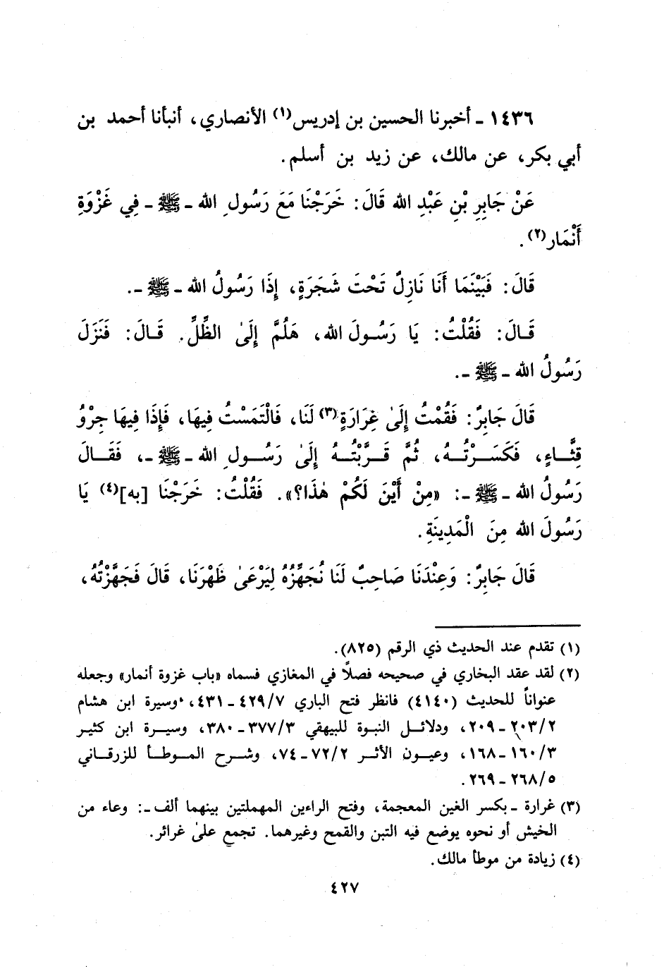 1436 - أخبرنا الحسين بن إدريس (¬1) الأنصاري، أنبأنا أحمد بن أبي بكر، عن مالك، عن زيد بن أسلم. عَن جَابِرِ بْنِ عَبْدِ الله قَالَ: خَرَجْنَا مَعَ رَسُولِ الله- صلى الله عليه وسلم - فِي غَزْوَةِ أَنْمَار (¬2) قَالَ: فَبَيْنَمَا أَنَا نَازِلٌ تَحْتَ شَجَرَةٍ، إذَا رَسُولُ الله - صلى الله عليه وسلم -. قَالَ: فَقُلْتُ: يَا رسول الله، هَلُمَّ إلَى الظِّلِّ. قَالَ: فَنَزَلَ رَسُولُ الله - صلى الله عليه وسلم -. قَالَ جَابِر: فَقُمْتُ إِلَى غِرَارَةٍ (¬3) لَنَا، فَالْتَمَسْتُ فِيهَا، فَإِذَا فِيهَا جِرْو قِثَّاءٍ فَكَسَرْتُة، ثمُّ قَرَّبْتُهُ إِلَى رَسُولِ الله - صلى الله عليه وسلم -، فَقَالَ رسُولُ الله - صلى الله عليه وسلم -"مِنْ أَيْنَ لَكُمْ هذَا؟ ". فَقلْتُ: خَرَجْنَا [به] (¬4) يَا رسُولَ الله مِنَ الْمَدِينَةِ. قَالَ جابر: وَعِنْدَنَا صَاحِب لَنَا نُجَهِّزُهُ لِيَرْعَى ظَهْرَنَا، قَالَ فَجَهُّزْتُة،