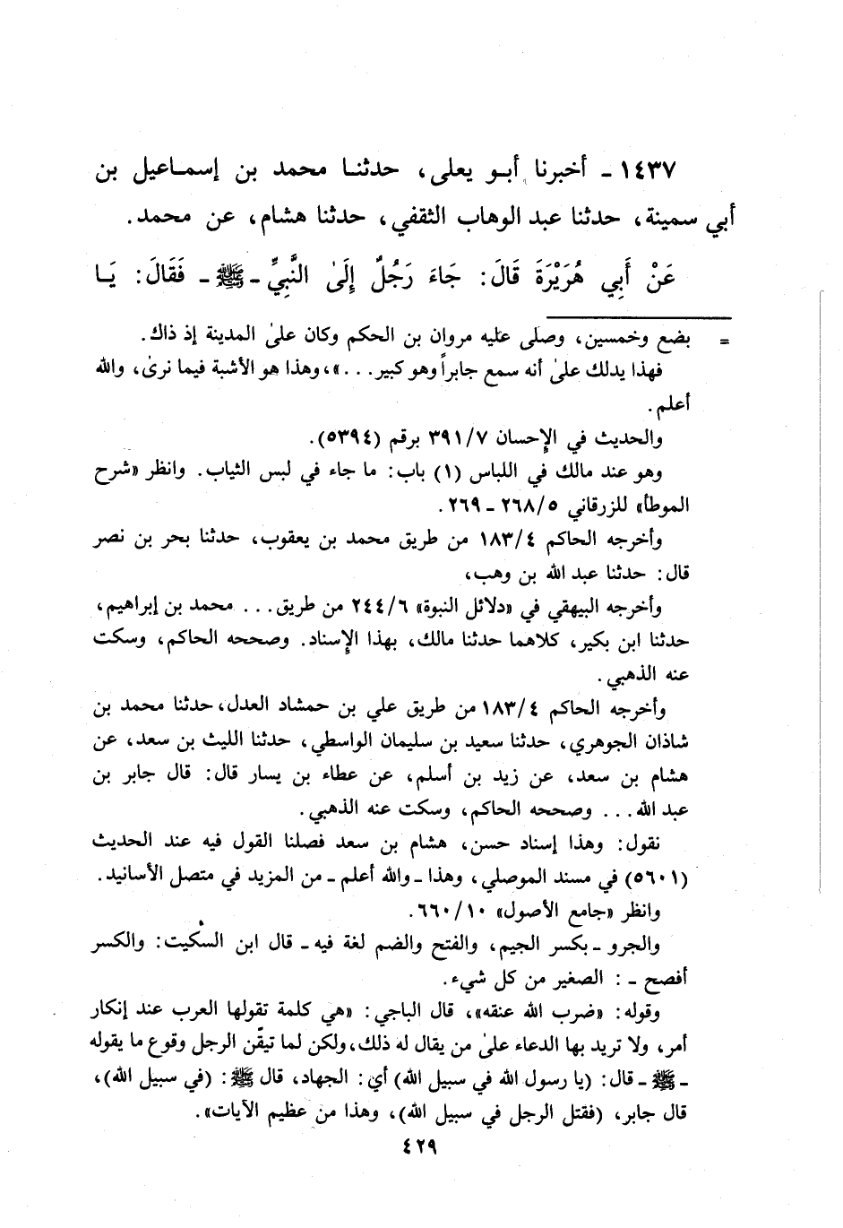 1437 - أخبرنا أبو يعلى، حدثنا محمد بن إسماعيل بن أبي سمينة، حدثنا عبد الوهاب الثقفي، حدثنا هشام، عن محمد. عَنْ أَبِي هُرَيْرَةَ قَالَ: جَاءَ رَجُلٌ إِلَى النَّبِيِّ - صلى الله عليه وسلم - فَقَالَ: يَا