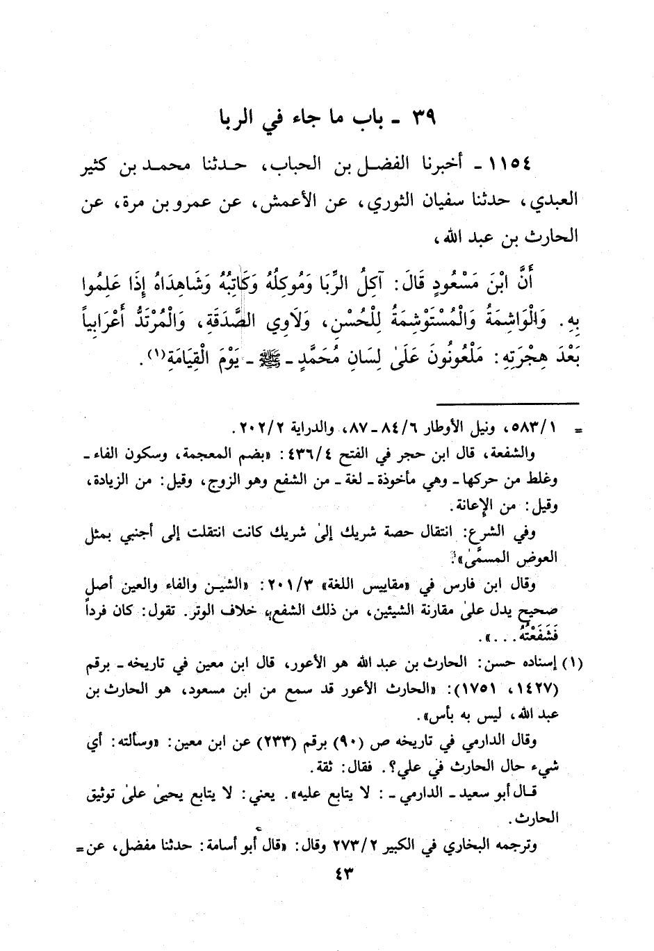1154 - أخبرنا الفضل بن الحباب، حدثنا محمد بن كثير العبدي، حدثنا سفيان الثوري، عن الأعمش، عن عمرو بن مرة، عن الحارث بن عبد الله، أنَّ ابْنَ مَسْعُودٍ قَالَ: آكِلُ الرِّبَا وَمُوكِلُهُ وَكَاتِبُهُ وَشَاهِدَاهُ إِذَا عَلِمُوا بِهِ. وَالْوَاشِمَةُ وَالْمُسْتَوْشِمَةُ لِلْحُسْنِ، وَلاَوِي الصَّدَقَةِ، وَالْمُرْتَدُّ أعْرَابِياً بَعْدَ هِجْرَتِهِ: مَلْعونُونَ عَلَى لِسَانِ مُحَمَّدٍ - صلى الله عليه وسلم - يَوْمَ الْقِيَامَةِ (¬1).