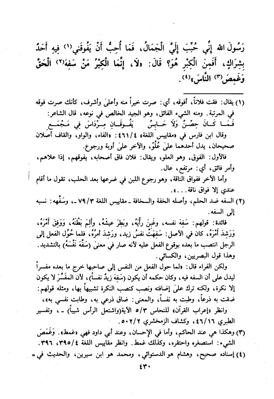 رَسُولَ الله إنِّي حُبِّبَ إليَّ الْجَمَالُ، فَمَا أُحِبُّ أَنْ يَفُوقَني (¬1) فِيهِ أَحَدٌ بِشِرَاكٍ، أَفَمِنَ الْكِبْرِ هُوَ؟ قَالَ: "لا، إنَّمَا الْكِبْرُ مَنْ سَفِهَ (¬2) الْحَقَّ وَغَمِصَ (¬3) النَّاسَ" (¬4).