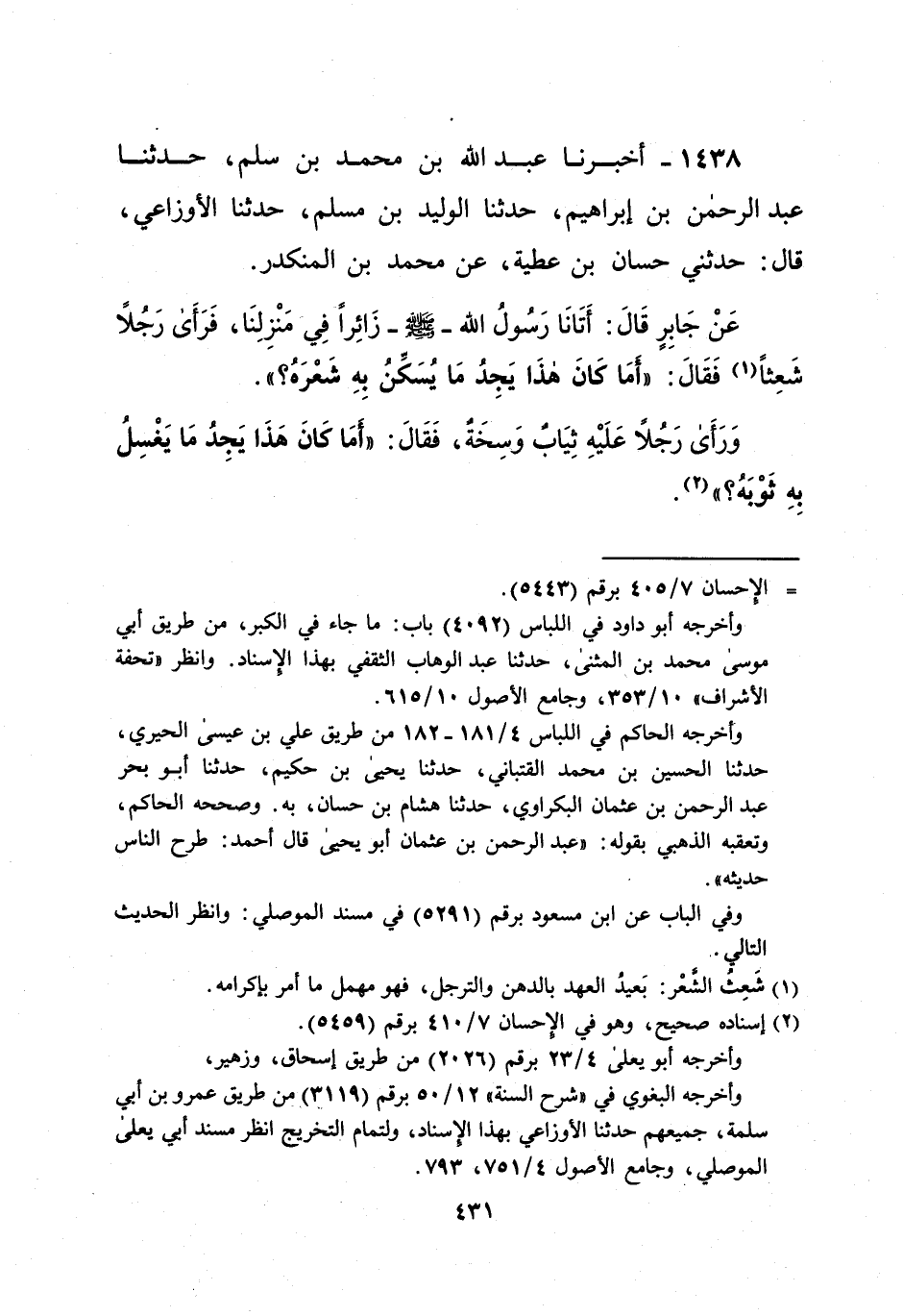1438 - أخبرنا عبد الله بن محمد بن سلم، حدثنا عبد الرحمن بن إبراهيم، حدثنا الوليد بن مسلم، حدثنا الأوزاعي، قال: حدثني حسان بن عطية، عن محمد بن المنكدر.