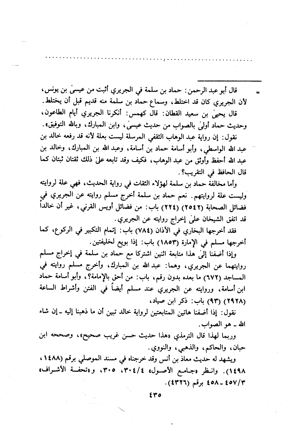 وأما مخالفة حماد بن سلمة لهؤلاء الثقات في رواية الحديث، فهي علة لروايته وليست علة لروايتهم. نعم حماد بن سلمة أخرج مسلم روايته عن الجريري في فضائل الصحابة (2542) (224) باب: من فضائل أويس القرني، غير أن خالداً قد اتفق الشيخان على إخراج روايته عن الجريري.