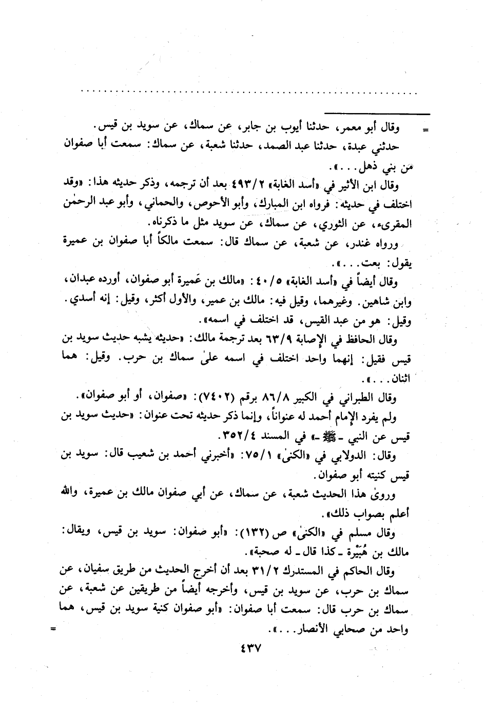 وقال ابن الأثير في "أسد الغابة" 2/ 493 بعد أن ترجمه، وذكر حديثه هذا: "وقد اختلف في حديثه: فرواه ابن المبارك وأبو الأحوص، والحماني، وأبو عبد الرحمن المقرئ، عن الثوري، عن سماك، عن سويد مثل ما ذكرناه. ورواه غندر، عن شعبة، عن سماك قال: سمعت مالكاً أبا صفوان بن عميرة يقول: بعت ... ".