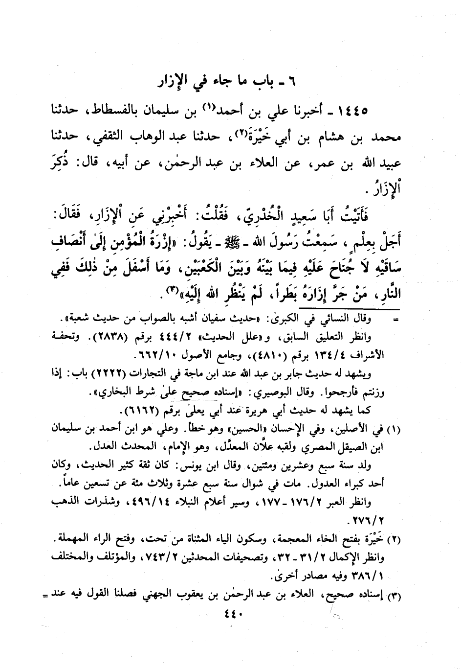 1445 - أخبرنا علي بن أحمد (¬1) بن سليمان بالفسطاط، حدثنا محمد بن هشام بن أبي خَيْرَةَ (¬2)، حدثنا عبد الوهاب الثقفي، حدثنا عبيد الله بن عمر، عن العلاء بن عبدالرحمن، عن أبيه، قال: ذُكِرَ اْلإزَارُ.