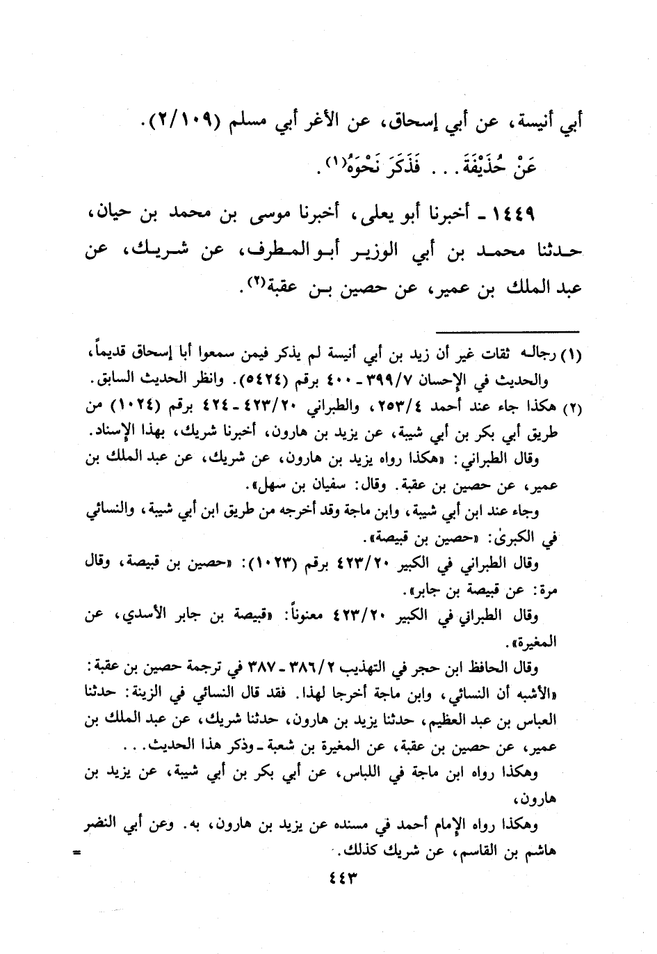 1449 - أخبرنا أبو يعلى، أخبرنا موسى بن محمد بن حيان، حدثنا محمد بن أبي الوزير أبو المطرف، عن شريك، عن عبد الملك بن عمير، عن حصين بن عقبة (¬2).