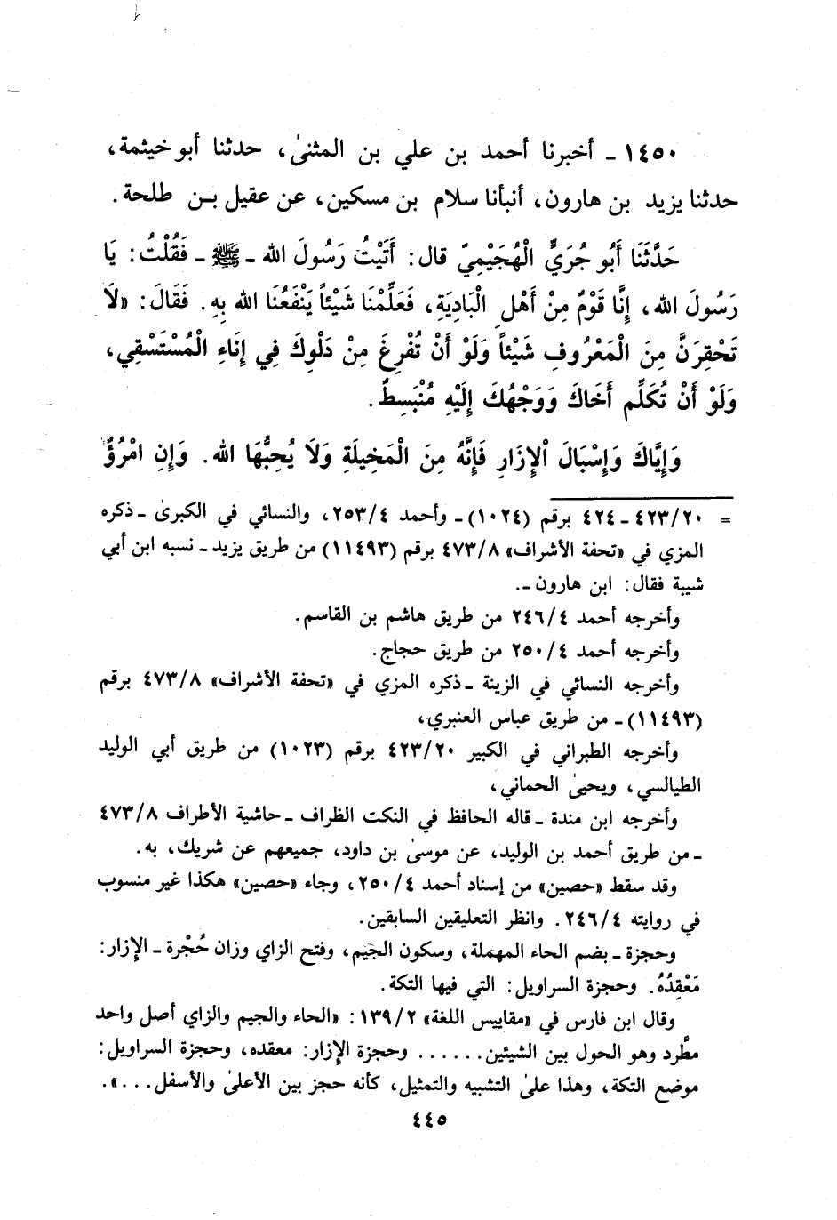 حَدَّثَنَا أَبُو جُريٍّ الْهُجَيْمِى قال: أَتَيْتُ رسُولَ الله - صلى الله عليه وسلم - فَقلْتُ: يَا رَسُولَ الله، إِنَّا قَوْم مِنْ أَهْلِ الْبَادِيَةِ، فَعَلِّمْنَا شَيْئاً يَنْفَعُنَا الله بِهِ. فَقَالَ: "لا تَحْقِرَنَّ مِنَ الْمَعْرُوفِ شَيْئاً وَلَوْ أَنْ تُفْرِغَ مِنْ دَلْوِكَ فِي إِنَاءِ الْمُسْتَسْقِي، وَلَوْ أَنْ تُكَلِّم أخَاكَ وَوَجْهُكَ إِلَيْهِ مُنْبَسِطٌ. وَأيَّاكَ وَإِسْبَالَ اْلإِزَارِ فَإِنَّهُ مِنَ الْمَخِيلَةِ وَلا يُحِبُّهَا الله. وَإِنِ امْرُؤ