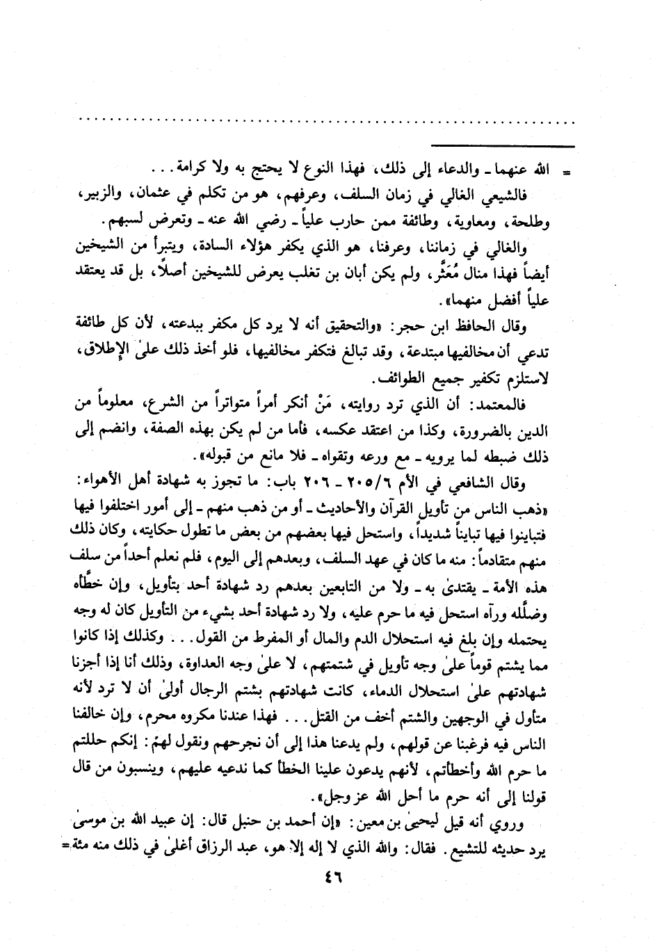 = الله عنهما- والدعاء إلى ذلك، فهذا النوع لا يحتج به ولا كرامة ... فالشيعي الغالي في زمان السلف، وعرفهم، هو من تكلم في عثمان، والزبير، وطلحة، ومعاوية، وطائفة ممن حارب علياً -رضي الله عنه- وتعرض لسبهم.