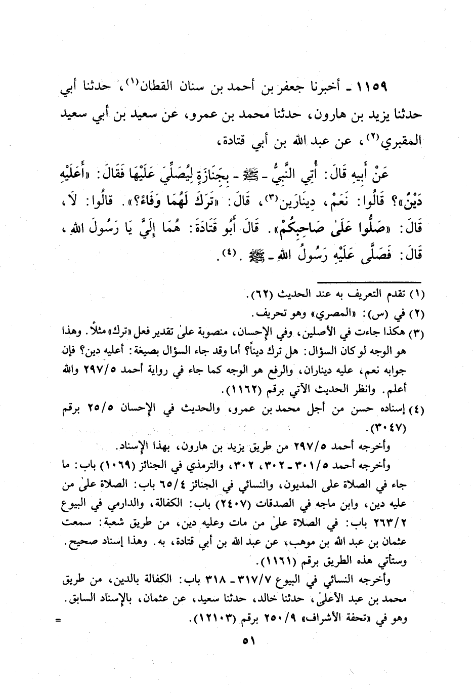 1159 - أخبرنا جعفر بن أحمد بن سنان القطان (¬1)، حدثنا أبي حدثنا يزيد بن هارون، حدثنا محمد بن عمرو، عن سعيد بن أبي سعيد المقبري (¬2)، عن عبد الله بن أبي قتادة،