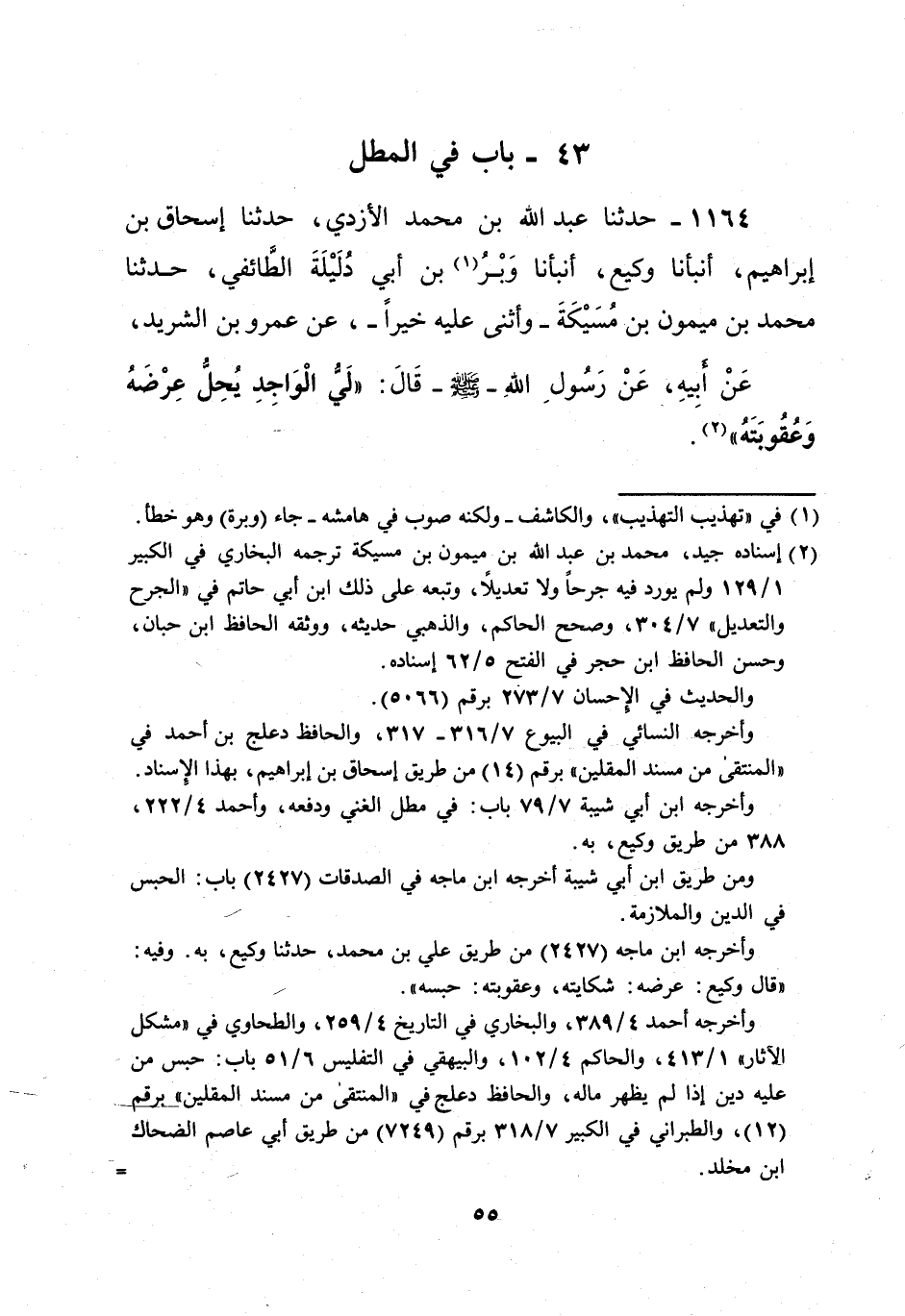 1164 - حدثنا عبد الله بن محمد الأزدي، حدثنا إسحاق بن إبراهيم، أنبأنا وكيع، أنبأنا وَبْرُ (¬1) بن أبي دُلَيْلَةَ الطَّائفي، حدثنا محمد بن ميمون بن مُسَيْكَةَ- وأثنى عليه خيراً-، عن عمرو بن الشريد، عَنْ أَبِيهِ، عَنْ رَسُولِ اللهِ - صلى الله عليه وسلم - قَالَ: "ليُّ الْوَاجِدِ يُحِلُّ عِرْضَهُ وَعُقُوبَتَهُ" (¬2).