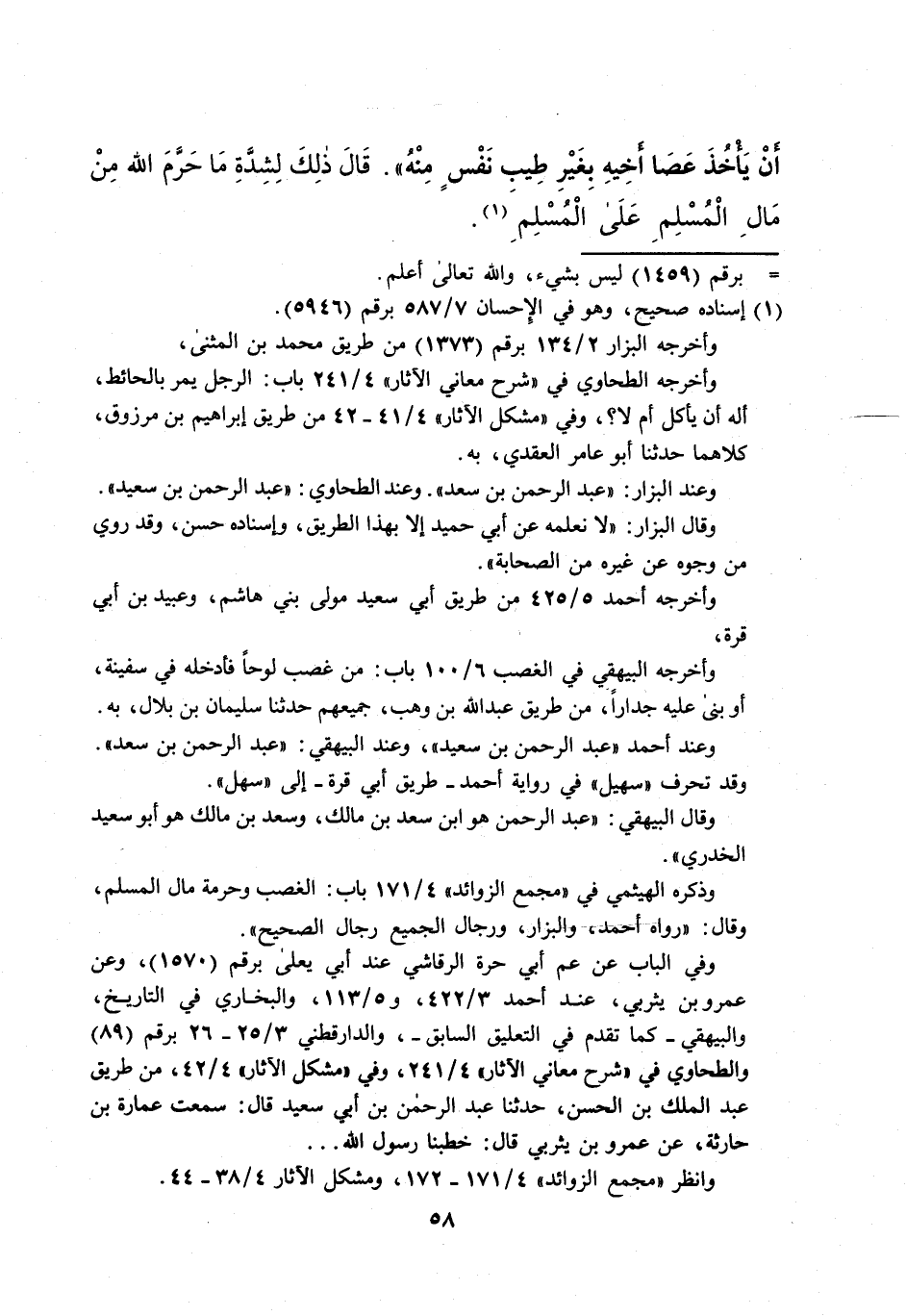 أنْ يَأْخُذَ عَصَا أخِيهِ بِغَيْرِ طِيب نَفْسٍ مِنْهُ". قَالَ ذلِكَ لِشِدَّةِ مَا حَرَّمَ الله مِنْ مَالِ الْمُسْلِمِ عَلَى الْمُسْلِمِ (¬1).