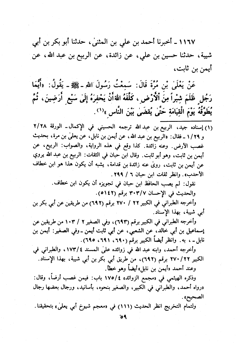 1167 - أخبرنا أحمد بن علي بن المثنى، حدثنا أبو بكر بن أبي شيبة، حدثنا حسين بن علي، عن زائدة، عن الربيع بن عبد الله، عن أيمن بن ثابت، عَنْ يَعْلَى بْنِ مُرَّةَ قَالَ: سَمِعْتُ رَسُولَ اللهِ - صلى الله عليه وسلم - يَقُولُ: "أيُّمَا رَجُل ظَلَمَ شِبْراً مِنَ اْلأرْضِ، كَلَّفَهُ اللهُ أنْ يَحْفِرَهُ إِلَى سَبْعِ أرَضِينَ، ثُمَّ يُطَوَّقُهُ يَوْمَ الْقِيَامَةِ حَتَّى يُقضَى بَيْنَ النَّاسِ" (¬1).