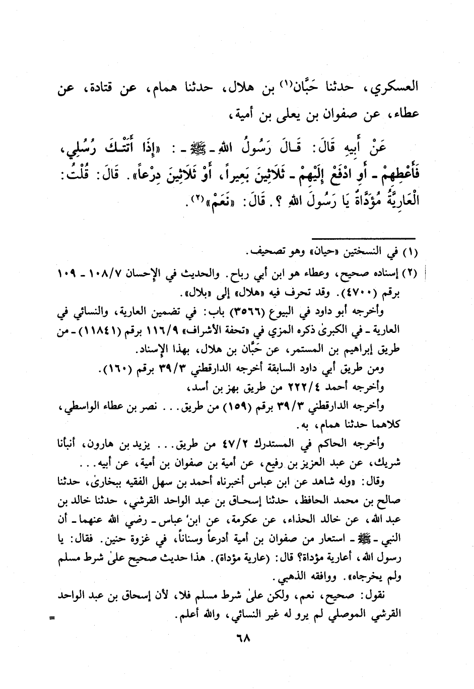 وأخرجه الحاكم في المستدرك 2/ 47 من طريق ... يزيد بن هارون، أنبأنا شريك، عن عبد العزيز بن رفيع، عن أمية بن صفوان بن أمية، عن أبيه ... وقال: "وله شاهد عن ابن عباس أخبرناه أحمد بن سهل الفقيه ببخارى، حدثنا صالح بن محمد الحافظ، حدثنا إسحاق بن عبد الواحد القرشي، حدثنا خالد بن عبد الله، عن خالد الحذاء، عن عكرمة، عن ابنُ عباس -رضي الله عنهما- أن النبي - صلى الله عليه وسلم -استعار من صفوان بن أمية أدرعاً وسناناً، في غزوة حنين. فقال: يا رسول الله، أعارية مؤداة؟ قال: (عارية مؤداة). هذا حديث صحيح على شرط مسلم ولم يخرجاه". ووافقه الذهبي.