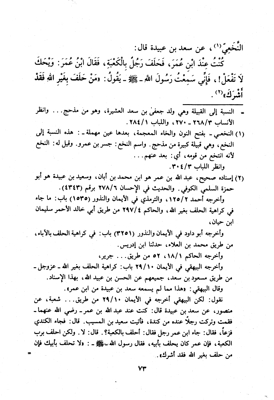 كُنْتُ عِنْدَ ابْنِ عُمَرَ، فَحَلَفَ رَجُلٌ بِالْكَعْبَةِ، فَقَالَ ابْنُ عُمَرَ: ويحَكَ لا تَفْعَلْ!، فَإنِّي سَمِعْتُ رَسُولَ اللهِ- صلى الله عليه وسلم - يَقُولُ: "مَنْ حَلَفَ بِغَيْرِ اللهِ فَقَدْ أشْرَكَ" (¬2).