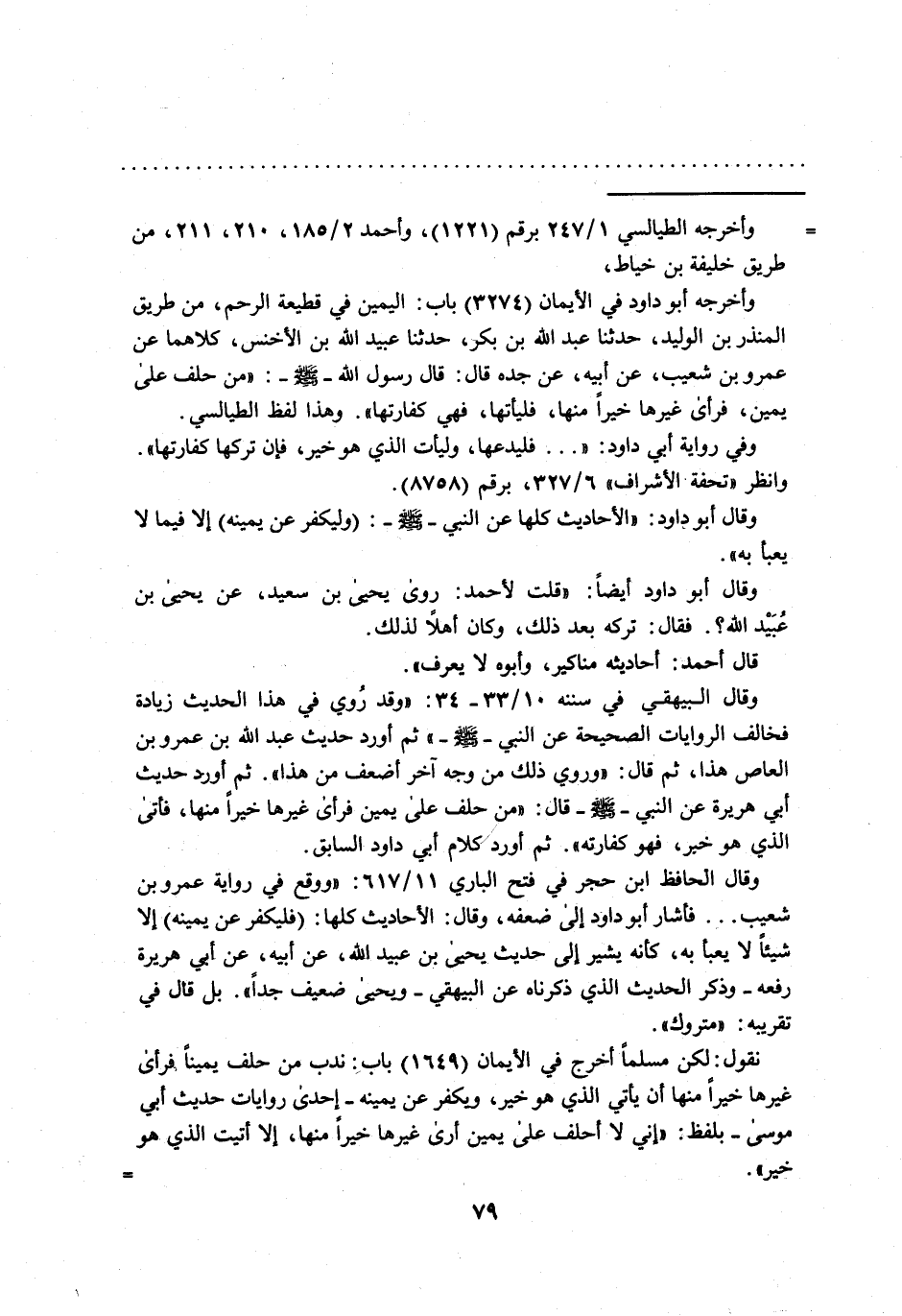 وقال البيهقي في سننه 10/ 33 - 34: "وقد رُوي في هذا الحديث زيادة فخالف الروايات الصحيحة عن النبي- صلى الله عليه وسلم -" ثم أورد حديث عبد الله بن عمرو بن العاص هذا، ثم قال:"وروي ذلك من وجه آخر أضعف من هذا". ثم أورد حديث أبي هريرة عن النبي - صلى الله عليه وسلم - قال: "من حلف على يمين فرأى غيرها خيراً منها، فأتى الذي هو خبر، فهو كفارته". ثم أورد كلام أبي داود السابق.